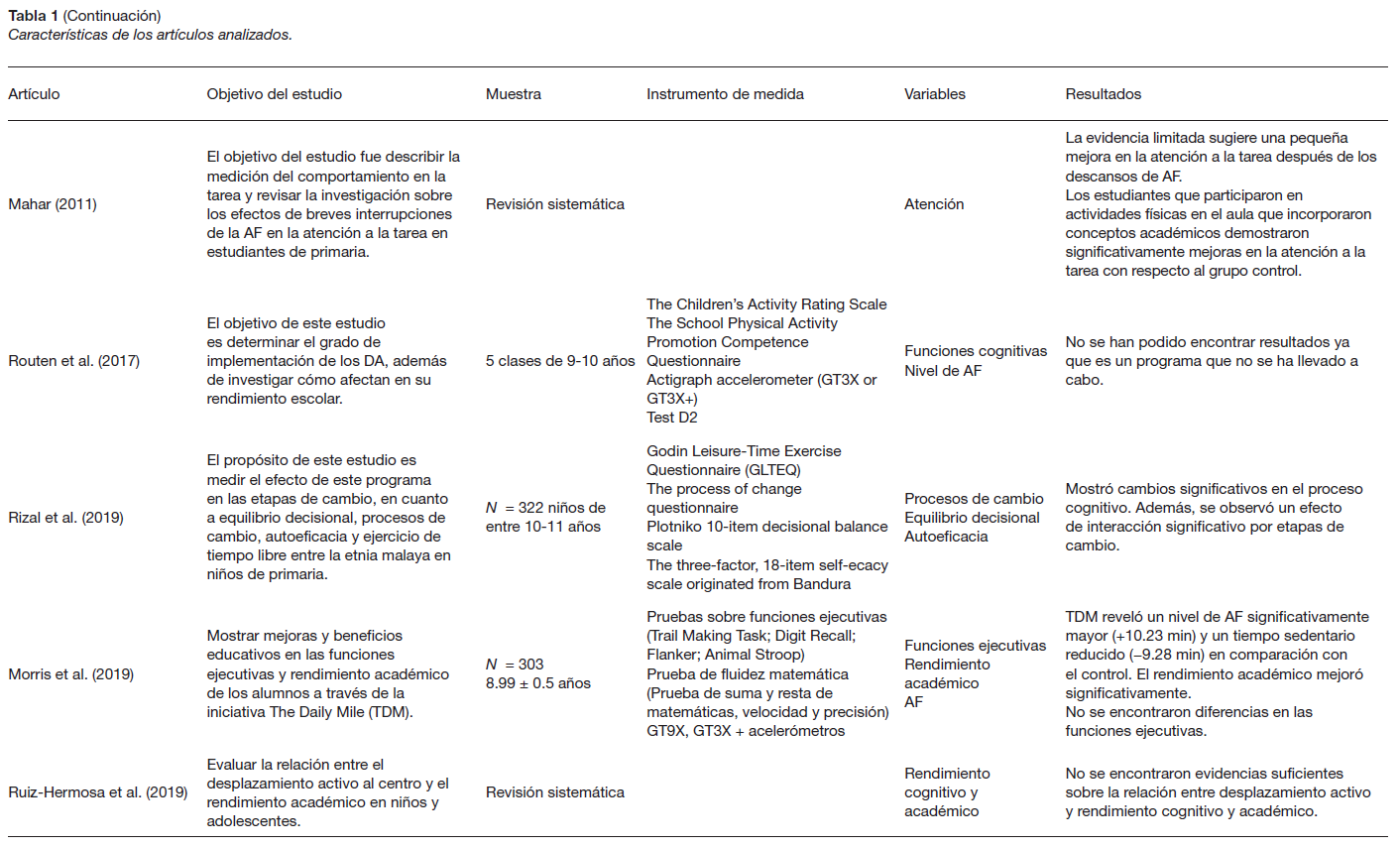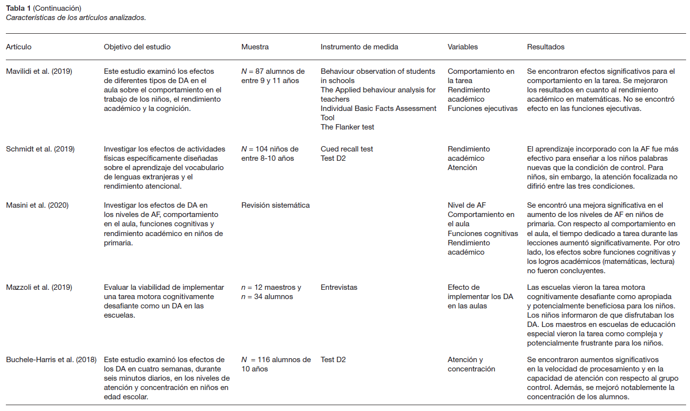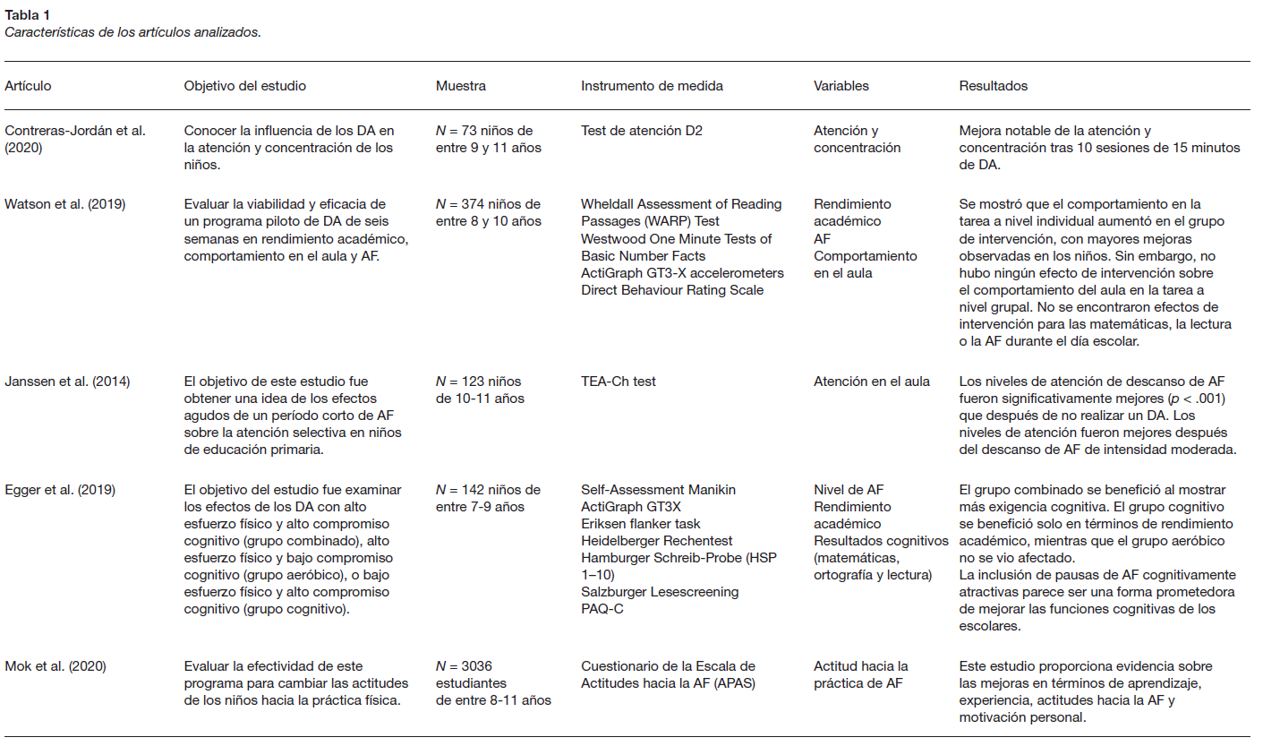 En cuanto a las variables, del total de los 19 artículos seleccionados, 7 tienen como variable la atención. Por otro lado, 7 artículos presentan el rendimiento académico como una de sus variables. Además, 5 artículos cuentan el nivel de AF como una de sus variables principales. En cuanto a las funciones cognitivas ejecutivas, encontramos 5 artículos. Finalmente, encontramos, entre otras variables, la actitud hacia la AF, memoria de trabajo e inhibición, el efecto de implementar los DA (Mazzoli et al., 2019) o los procesos de cambio y autoeficacia.
