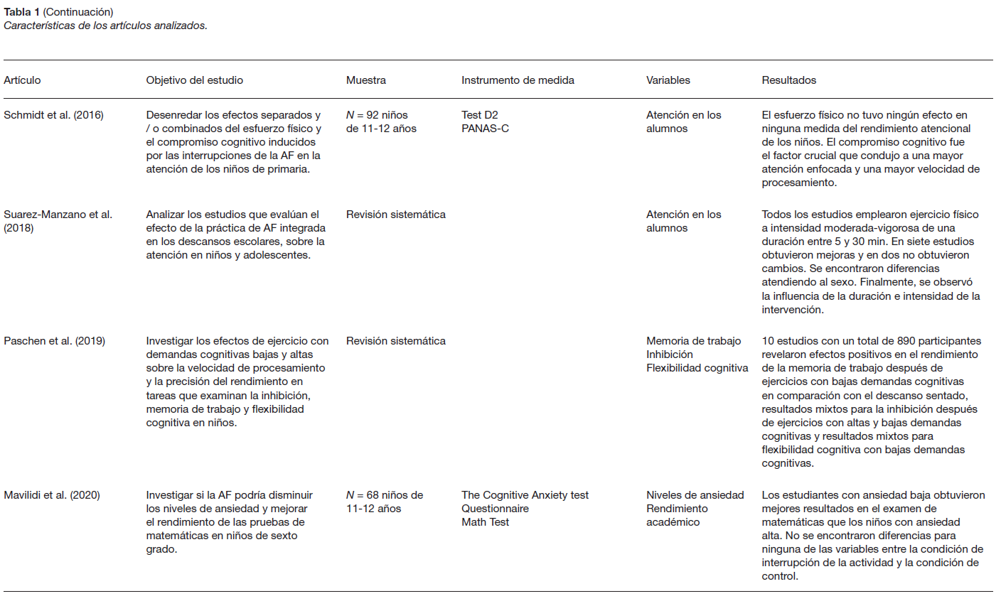 De los 19 artículos seleccionados, excluyendo las 5 revisiones sistemáticas (Paschen et al., 2019; Suarez-Manzano et al., 2018; Masini et al., 2020; Mahar, 2011; Ruiz-Hermosa et al., 2019), 6 artículos han utilizado estos instrumentos para medir la atención, como el Test D2, el TEA-Ch Test o el PANAS-C. Por otro lado, se han utilizado una serie de acelerómetros para medir el nivel de AF, utilizándose el ActiGraph GT3-X. Para observar el rendimiento académico, 5 artículos han utilizado diferentes instrumentos, destacando el Wheldall Assessment of Reading Passages Test (WARP) o el Westwood One Minute Tests of Basic Number Facts, Math Test o el Cued Recall Test. Por otro lado, 2 artículos también se han centrado en el nivel de AF, utilizando PAQ-C, The School Physical Activity Promotion Competence Questionnaire. Por último, 2 estudios han utilizado herramientas diferentes, como las entrevistas o el Cuestionario de la Escala de Actitudes hacia la AF (APAS).