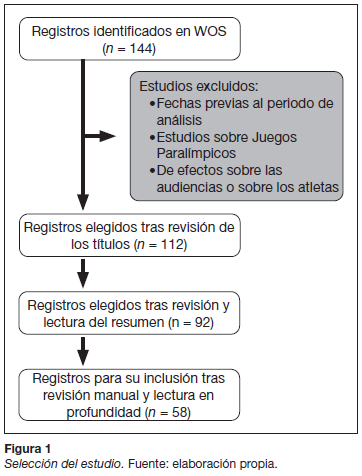 Tal y como se aprecia en la Figura 1, la búsqueda dio como resultado un total de 144 registros específicos en WOS. A continuación, se refinó la búsqueda a través de una revisión de los artículos, eliminando todos aquellos que fueran anteriores al periodo establecido, también los centrados en los Juegos Paralímpicos, por tener otras características diferentes de cara al análisis, así como los estudios enfocados en los efectos que tiene sobre las audiencias o sobre los deportistas de élite una cobertura desigual de los medios, por contar con objetivos diferentes a los de esta investigación, quedando reducidos a 112.