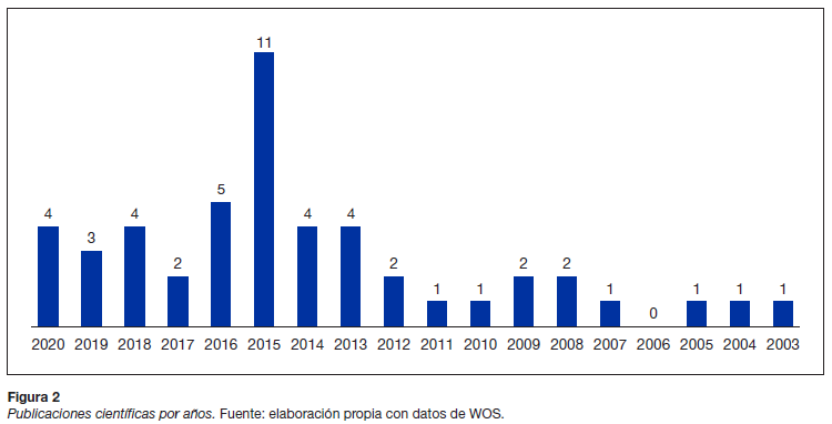 Los estudios sobre género y olimpismo en los medios cuentan con una evidente evolución, según vemos en la Figura 2. Estos han pasado de contar a principios del 2000 con una escasa presencia de apenas una o dos publicaciones al año a tener, a partir de los Juegos Olímpicos de Londres 2012, un amplio desarrollo, con cuatro publicaciones anuales en los dos años siguientes a estos Juegos, hasta alcanzar un máximo histórico de 11 publicaciones en total en 2015, con una bajada en 2017 hasta dos estudios, para mantenerse en torno a cuatro publicaciones por año los siguientes años.