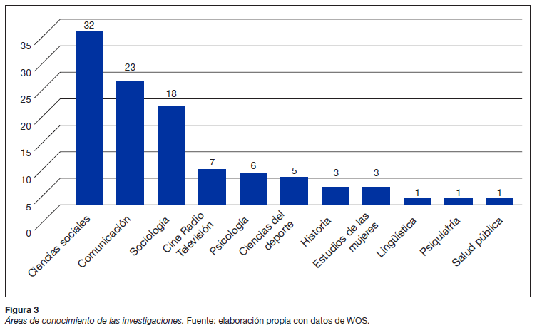 Los estudios de mujeres, medios y deporte, dada su interdisciplinariedad, han ido avanzando por áreas muy diferentes a lo largo de su desarrollo (Fig. 3), con las ciencias sociales o la comunicación como las más predominantes, aunque también destacan las ciencias del deporte, la psicología, la historia o la lingüística, y en algunos casos hemos encontrado registros que estaban presentes en varias disciplinas simultáneamente. Así, el mayor porcentaje lo concentraron las ciencias sociales, con el 55 % del total de publicaciones, destacando trabajos como los de Xu et al. (2020, 2019, 2018), enfocados en los dos últimos eventos olímpicos (los Juegos de verano de 2016 e invierno de 2018) y centrados en analizar la cobertura de las televisiones china y australiana. Estos encontraron una infrarrepresentación femenina, pero, sobre todo, una clara diferenciación en las atribuciones del éxito y fracaso de los atletas, dado que ellas triunfaban por sus habilidades y ellos, por su experiencia. En áreas como la comunicación, que alcanzó un 40 %, destacan trabajos sobre prensa escrita, tales como los de Delorme y Pressland (2016) o Delorme y Testard (2015), este último basado en el análisis fotográfico. Ambos describieron diferencias significativas tanto en la cantidad como en la calidad de la cobertura, con sesgos de género, invisibilización y subrepresentación femenina. Otra área representativa fue la sociología, que alcanzó un 31 %, destacando estudios sobre la restauración de la imagen y las disculpas públicas de las deportistas (Litchfield, 2018), nociones que fueron reexaminadas y modificadas desde los estudios del deporte, el género y la tercera ola feminista. También encontramos en esta área trabajos como el de Amara (2012), con un estudio sobre el discurso mediático en el choque de culturas, centrado en la representación de las deportistas musulmanas y el uso del velo en los Juegos de Pekín 2008. Por su parte, el cine, radio y televisión alcanzaron un 12 % del total y los estudios de esta disciplina estaban enfocados principalmente en la cobertura televisiva, encontrándose un mayor tiempo en antena y más menciones masculinas (61.2 %), diferencias notables en las descripciones físicas y de la personalidad en función del sexo (Billings, 2007; MacArthur et al., 2017), más imágenes de partes del cuerpo femenino y estatus deportivo inferior (Kian et al., 2013), así como diferencias en la producción técnica visual, haciendo que el deporte femenino se mostrase como menos emocionante (Greer et al., 2009). Otras áreas destacadas fueron la psicología, con el 10.3 %, o las ciencias del deporte (8.6 %), que compartían artículos con áreas ya mencionadas. En esta última encontramos los trabajos de Xu et al., 2019; Litchfield y Kavanagh, 2019; Dashper, 2018 o Litchfield, 2018, entre otros. El resto de áreas, aunque se percibieron como minoritarias, trasladaron estos estudios a la historia, al abordar la evolución histórica de la representación femenina en deportes masculinos como el esquí y su impacto en la mayor participación femenina actual (Hofmann, 2012), la salud pública o la psiquiatría. En último lugar, también encontramos trabajos sobre lingüística, como el de Zhang (2015), centrado en las construcciones lingüísticas de género sobre las gimnastas chinas en la cobertura occidental y china, para revelar discriminación de género en ambas. En la primera se descubrió un discurso infantil, victimizado y pasivo ante la dureza del modelo de entrenamiento chino y en la segunda, un discurso de sumisión, inocencia y obediencia a las normas del país.