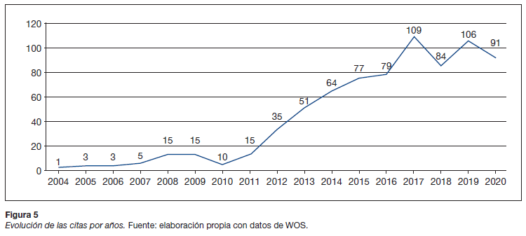 Cabe destacar que, de forma conjunta, las publicaciones científicas sobre cobertura mediática femenina en los Juegos alcanzan un total de 763 citas, con un promedio de 13.16 citas cada artículo, 44.8 citas por año de todos los estudios y un índice h de 15. Además, encontramos un gran crecimiento de las citas desde el año 2011 (con 15), para llegar a su máximo en 2017 (con 109 en total). El año siguiente se produjo una cierta bajada, hasta las 84, y de nuevo, un incremento en 2019 (a 106), para alcanzar en lo que va de año (2020) las 91 (Fig. 5).
