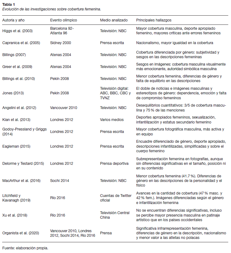 La siguiente tabla (Tabla 1) recoge algunas de las investigaciones más importantes de las distintas ediciones de los Juegos Olímpicos publicadas desde el 2000. Cabe destacar los primeros trabajos centrados especialmente en la televisión norteamericana (NBC), que encontraron, en primer lugar, una mayor cobertura masculina que femenina a lo largo de distintos Juegos (Angelini et al., 2012; Billings, 2007; Billings et al., 2010; Higgs et al., 2003), para ir incorporando después otros tipos de estudios que desvelaron diferencias de género basadas en sesgos según el deporte, por ejemplo, los de invierno, considerados más masculinos, puesto que suelen ser de mayor esfuerzo y contacto físico (Billings, 2007). Pero los estudios también se ampliaron a las imágenes, más emocionantes en el caso de los deportistas varones, como se ve en los Juegos de Atenas 2004 (Greer et al., 2009), o al uso del lenguaje, con diferencias en las descripciones de la personalidad y físico de los atletas, en el caso de Sochi 2014 (MacArthur et al., 2016).