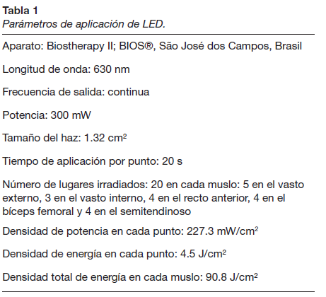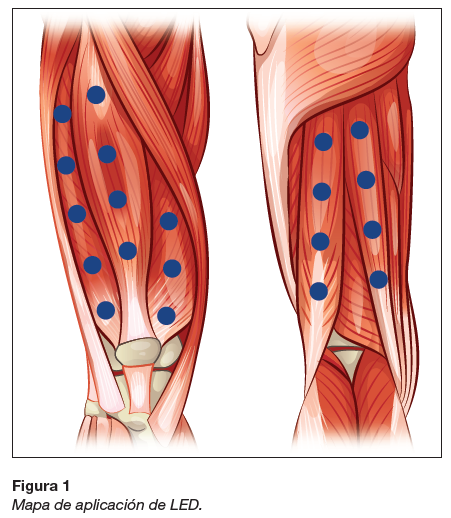 La terapia con diodos emisores de luz (LED) o placebo se realizó con un equipo comercial (Tabla 1). El equipo se colocó sobre los músculos cuádriceps e isquiotibiales en contacto con la piel, según la Figura 1. En cada punto, se irradiaron 6 J de energía (20 s de aplicación), aplicándose 120 J de energía en total en cada muslo. El procedimiento con placebo se realizó con el aparato apagado, sin conocimiento de los jugadores, dado que los dos grupos (LED y placebo) llevaban un antifaz durante la aplicación del protocolo. LED y placebo se aplicaron en los mismos lugares anatómicos y con una duración similar. La longitud de onda de LED y la energía irradiada se aplicaron según revisiones sistemáticas previas (Leal-Junior et al., 2015; Vanin et al., 2018). Antes de los procedimientos experimentales, a los jugadores de ambos grupos (LED y placebo) se les explicó el efecto de la aplicación de LED, con el fin de convencerlos de que la terapia con LED es efectiva para acelerar la recuperación.