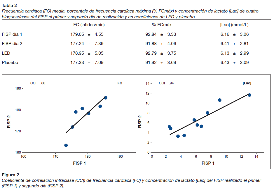 Los jugadores presentaron una FCmáx de 194 ± 5 latidos/min en el test YO-YOir1. La FC media y el % FCmáx (n = 7; Tabla 2) fueron similares en ambos FISP, analizados de forma independiente del tratamiento aplicado (p = .31; p = .30, respectivamente), y al comparar LED con placebo (p = .58; p = .61, respectivamente). Tres participantes no fueron incluidos en el análisis de la FC por errores técnicos asociados con el registro de la FC. La [Lac] media obtenida en el FISP (Tabla 2) fue similar en la primera y la segunda tanda, analizada de forma independiente del tratamiento realizado (p = .61) y cuando se compararon LED y placebo (p = .86). El CCI de la FC fue muy grande y el de la [Lac] casi perfecto (Figura 2).