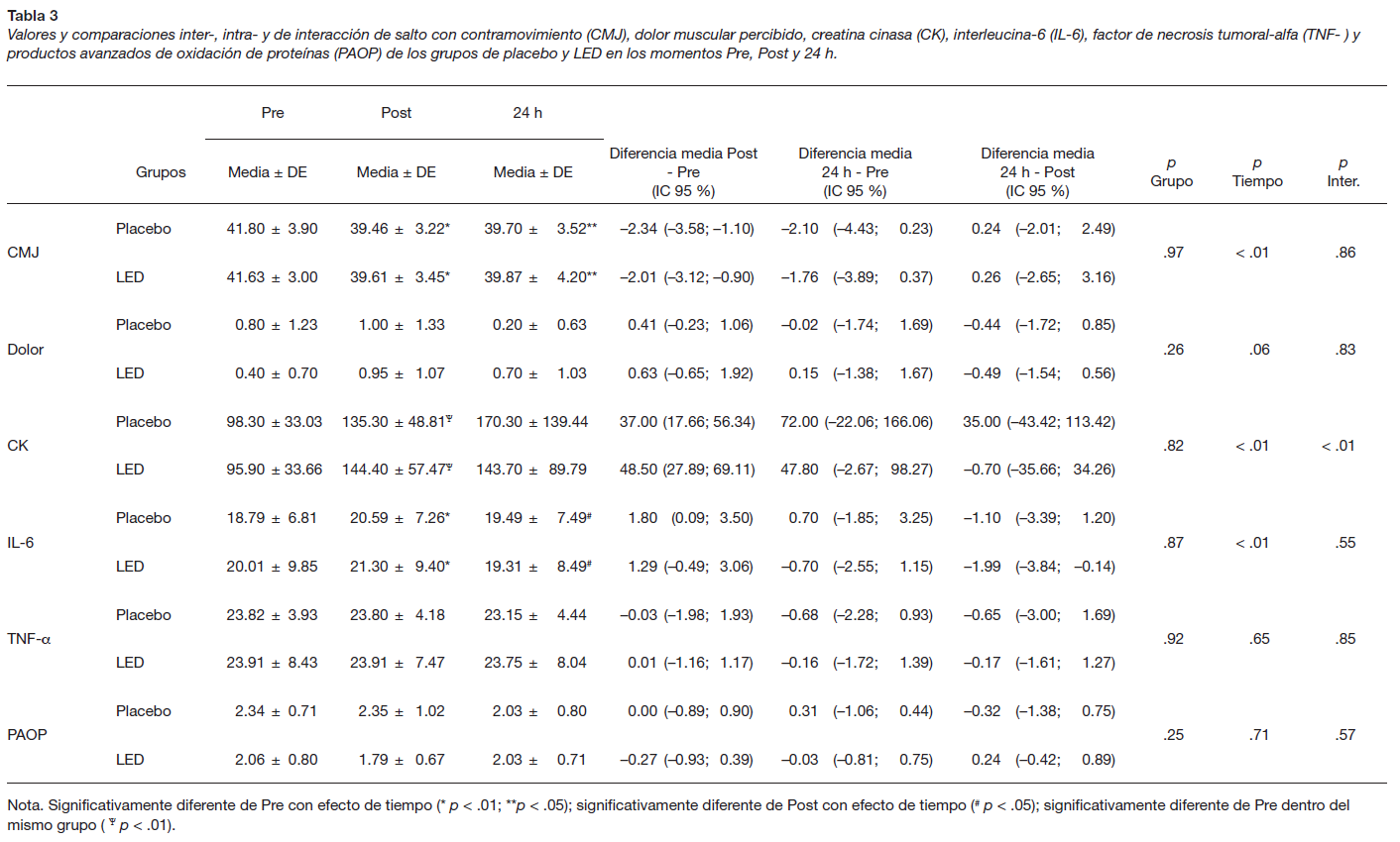 Para CMJ e IL-6, la GEE no demostró efectos de interacción o grupo (p > .05), pero mostró un efecto de tiempo (p < .01; Tabla 3). Las comparaciones por pares mostraron que los valores del CMJ fueron menores en el momento Post (p < .01) y 24 horas después (p = .01) comparado con Pre, y que los valores Post no fueron diferentes a las 24 horas (p = 1). La concentración sanguínea de IL-6 aumentó en el momento Post comparado con Pre (p < .01) y el valor de IL-6 a las 24 horas fue menor que en Post (p = .04), pero no diferente de Pre (p = 1), dato que sugiere que la IL-6 volvió a valores Pre a las 24 horas del FISP. Para CK, la GEE mostró efectos de interacción y tiempo, pero no de grupo (Tabla 3). Las comparaciones por pares mostraron un aumento de CK con placebo (p < .01) y LED (p < .01) en el momento Post comparado con Pre. Sin embargo, no se observaron diferencias en ningún grupo cuando se comparó el momento 24 h con Pre y Post (p > .05). Para dolor muscular, TNF-α y PAOP, la GEE no demostró efectos de interacción, tiempo o grupo (p > .05; Tabla 3).