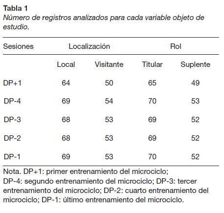Para valorar las diferencias entre el rol asumido por el jugador durante la competición, se clasificó a los futbolistas en titulares, si habían comenzado el partido dentro del once inicial, y suplentes, cuando i) habían participado en el partido una vez que este se había iniciado, ii) habían sido convocados, pero no habían jugado ningún minuto, iii) no habían sido convocados para ese partido. Para comprobar el efecto de la localización del partido, se tuvo en cuenta la condición de local, cuando el equipo jugaba en el campo de su propiedad, y de visitante, cuando el equipo analizado jugaba el partido en el campo del equipo rival (Tabla 1). Por otro lado, las sesiones de entrenamiento se clasificaron cronológicamente en función de su ubicación respecto a la siguiente competición (Sánchez-Sánchez, et al., 2019). En la primera sesión de entrenamiento de la semana (día postpartido [DP+1]) los jugadores titulares en el partido anterior realizaron un trabajo regenerativo (i.e., aeróbico de baja intensidad y ejercicios de movilidad), mientras que los futbolistas suplentes y no convocados hicieron un trabajo complementario (i.e., circuitos específicos con alta demanda neuromuscular). En la segunda sesión de entrenamiento (i.e., DP-4) se llevó a cabo un trabajo específico a través de juegos reducidos de alta demanda neuromuscular (50 m2/jugador) y trabajo preventivo (movilidad, fuerza excéntrica y core) para todos los jugadores de la plantilla. En el tercer entrenamiento de la semana (i.e., DP-3) se combinó en todos los futbolistas un trabajo de juegos reducidos (100 m2/jugador) con situaciones de 11 vs. 11 con orientación táctica defensiva. En el cuarto entrenamiento de la semana (i.e., DP-2) todos los jugadores participaron en situaciones orientadas a la optimización de la velocidad y aplicaciones 11 vs. 11 con orientación táctica ofensiva. En la última sesión de entrenamiento, realizada el mismo día de partido (i.e., DP-1), todos los futbolistas realizaron ejercicios de activación y acciones a balón parado. En todos los microciclos analizados, el día de descanso para los jugadores fue el siguiente a la sesión DP+1.