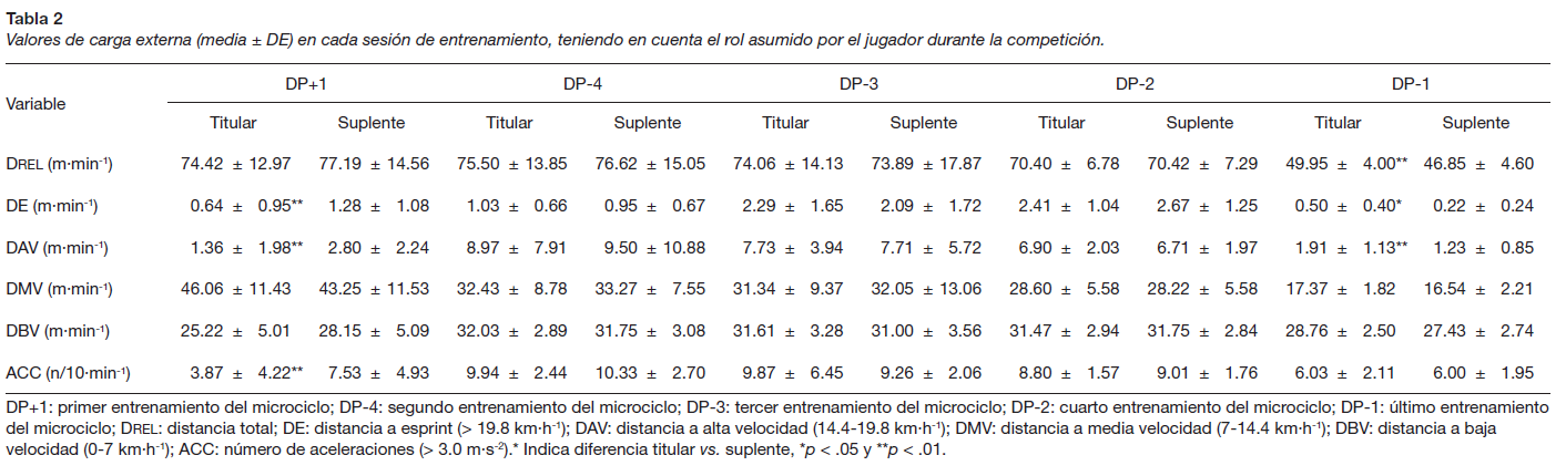 En la Tabla 2 se observa que en la sesión DP+1 las demandas de DE (d = 0.63), DAV (d = 0.69) y ACC (d = 0.68) fueron significativamente menores (p < .001, p < .000, p < .002 y p < .000, respectivamente) para los jugadores titulares que para los suplentes. Los resultados no mostraron diferencias significativas en la carga externa obtenida entre los jugadores titulares y los suplentes en las sesiones centrales del microciclo (i .e., DP-4, DP-3 y DP-2). Sin embargo, los valores encontrados en DP-1 indicaron que la carga externa para los jugadores titulares era significativamente mayor que para los suplentes (Drel: p < .01, d = -0.73; DE: p < .05, d = -0.83; DAV: p < .01, d = -0.51).