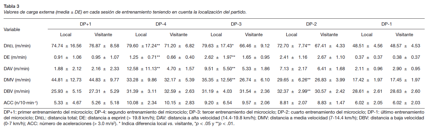Al analizar la carga externa de las sesiones en función de la localización del partido, las sesiones DP-4, DP-3 y DP-2 tuvieron, en general, valores de carga mayores cuando el equipo jugaba de local. Nuestros resultados coinciden con lo observado en otros trabajos realizados con futbolistas juveniles de alto nivel (Brito et al., 2016). Es posible que la carga neuromuscular sea menor en los microciclos que sirven para preparar los partidos en los que el equipo juega de visitante, para compensar la fatiga que acompaña a estas semanas, provocada por los viajes y las alteraciones en la rutina del sueño (Rago et al., 2019). Para hacer frente a esta circunstancia, los entrenadores regulan la carga de las sesiones y los propios jugadores adaptan su ritmo de entrenamiento semanal para mantener la fatiga dentro de unos límites asumibles que les permitan competir con garantías el fin de semana (Brito et al., 2016).