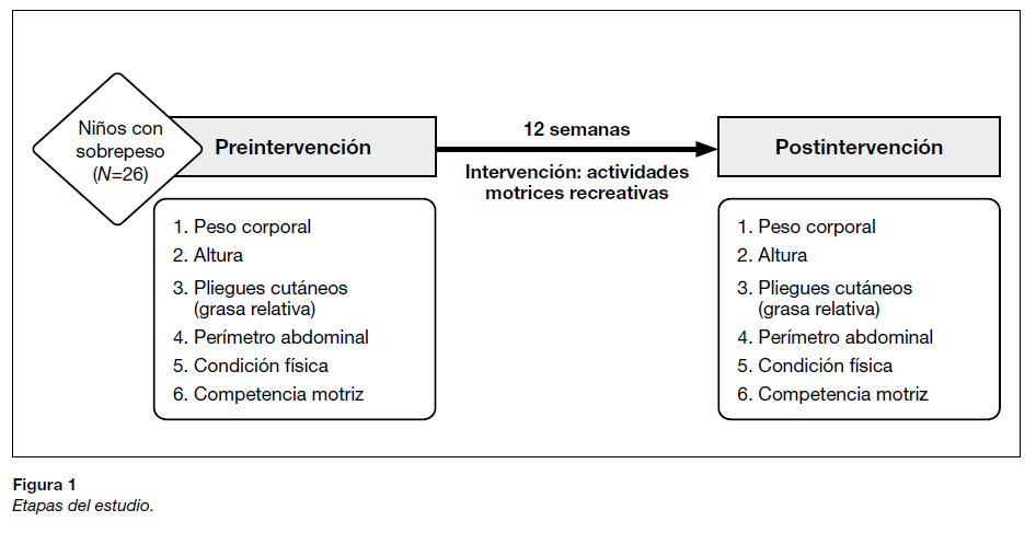 El criterio de elegibilidad para los niños incluidos fue un índice de masa corporal (IMC) superior al percentil 85, es decir, clasificado como sobrepeso según los criterios de los Centros de Control y Prevención de Enfermedades (Kuczmarski, 2002). Los niños sometidos a monitorización nutricional o ya incluidos en un programa de actividad física regular distinto de las clases de educación física habituales fueron excluidos del análisis de datos. La rutina de los niños no se cambió en relación con los hábitos alimentarios y solo se añadieron las sesiones programadas de actividades motrices recreativas. Además, se utilizaron las ecuaciones predictivas de Slaughter et al. (1988) para obtener información sobre la grasa relativa, para medir los pliegues cutáneos tricipital y subescapular.