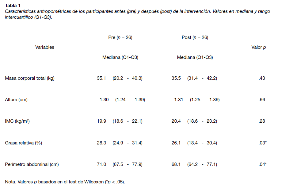 Respecto al impacto de la intervención sobre el control del peso corporal, en la Tabla 1 se muestran los valores de la mediana y el rango intercuartílico antes y después de la intervención de variables antropométricas y del crecimiento. Los resultados demuestran un efecto significativo de la intervención en la reducción de la grasa corporal relativa total y la adiposidad abdominal.