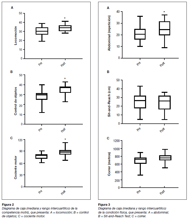 Para el resultado de condición física, se utilizó la batería de tests motores del Projeto Esporte Brasil (PROESP) (Gaya y Gaya, 2016). La condición física cardiorrespiratoria se investigó con el test de correr durante 6 minutos; el test abdominal se realizó para detectar la fuerza y la resistencia localizada; y el Sit-and-Reach Test, para comprobar los niveles de flexibilidad. Todos los tests se realizaron en la pista, siguiendo criterios específicos de ejecución y clasificación. Antes del día de evaluación oficial, se realizaron los tests con todos los niños para que se familiarizaran con los tests motores. La aplicación se realizó con un evaluador con experiencia y un ayudante. Los investigadores que escribieron y procesaron el análisis estadístico estuvieron enmascarados en la obtención de datos, el análisis de las habilidades motrices y el proceso de intervención.