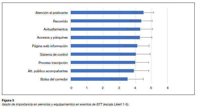 Finalmente, en la Figura 5 se muestra el grado de importancia que otorgaron los practicantes a los servicios y equipamientos en los eventos de BTT. Se encontró la atención al practicante como la más valorada, con un 4.52 (0.63), seguida del recorrido de la prueba, con 4.37 (0.70). En tercer y cuarto lugar, se valoraron los avituallamientos, con un 4.31 (0.80), y los accesos y párquines, con 4.28 (0.77).