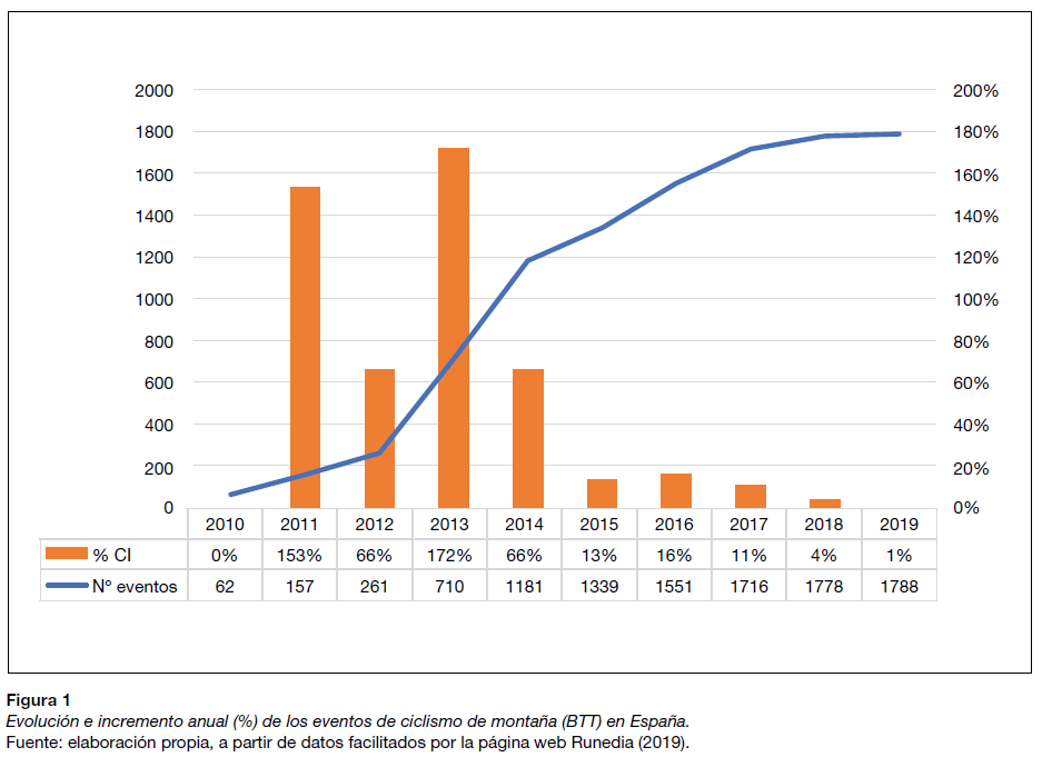 Un ejemplo más de la relevancia de la práctica de BTT lo podemos encontrar en la evolución de la oferta de eventos deportivos que incluyen esta práctica. Valga de ejemplo, tal y como se puede observar en la Figura 1, el incremento de eventos registrados en una de las páginas web más populares en la difusión de este tipo de acontecimientos deportivos a nivel nacional. Mientras que el número de eventos registrados era de 62 en el año 2010, en el año 2019 este número llegó a situarse en torno a los 1800, lo que viene a representar una tasa de crecimiento interanual (CI) de un 52 %, con picos durante los años 2011 y 2013, con un incremento en torno a un 153 % y 172 %, respectivamente.