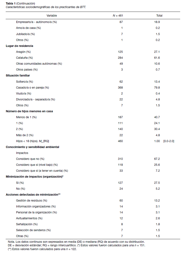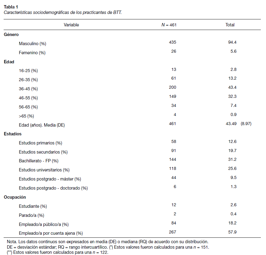 En la Tabla 1 se muestran los resultados referentes a las características sociodemográficas de los practicantes de BTT. Se observó una predominancia del género masculino (94.4 %) frente al femenino (5.6 %), con el 43.4 % en edades comprendidas entre 36 y 45 años, y la edad media de 43.49 (8.97) años. A su vez, se identificó un perfil con un nivel de estudios elevado (36.4 %, con estudios universitarios), empleado/a por cuenta ajena (57.9 %) y con residencia habitual en Cataluña (61.6 %). En cuanto a la situación familiar, la más común fue la de casado/a o en pareja (79.8 %) con una mediana de hijos menores en casa de 1.00 [0.00-2.00].
