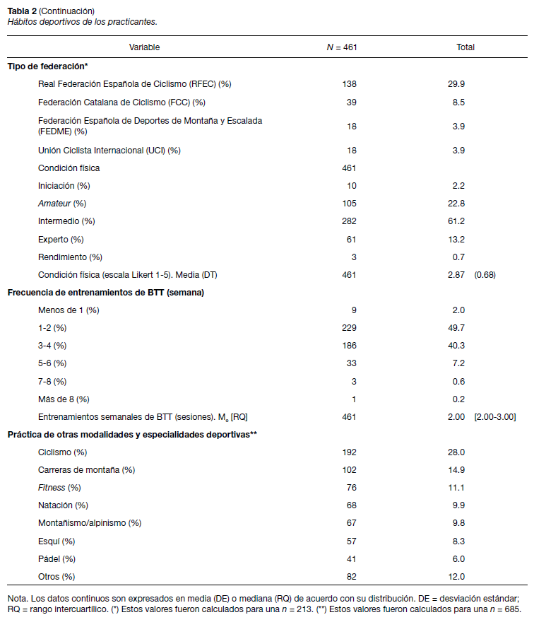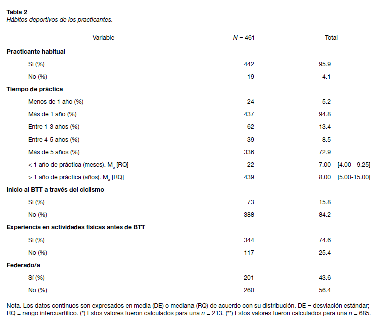 En la Tabla 2 se muestran los datos obtenidos en el estudio sobre los hábitos deportivos de los practicantes de BTT. Entre los principales resultados encontrados destacó el hecho de que más de un 95 % de los ciclistas encuestados afirmaron ser practicantes habituales de esta especialidad deportiva, con una experiencia mediana de 8.00 [5.00-15.00] años de práctica, entre los cuales el 72.9 % manifestó tener una antigüedad superior a los 5 años en esta especialidad.