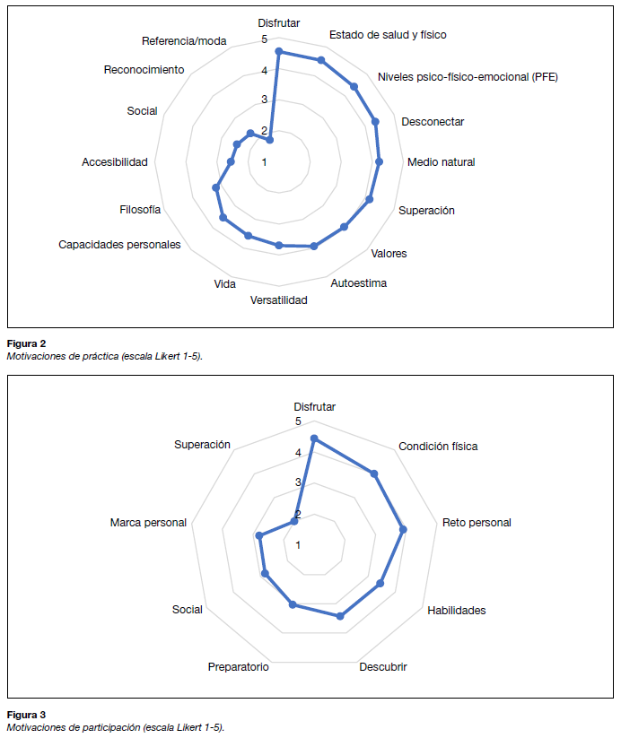 En relación con las motivaciones, se tuvieron en cuenta dos preguntas, ambas valoradas sobre una escala de 1 a 5. En la primera, se puntuó un listado de afirmaciones que justificaba la afición a la práctica de BTT. En la segunda, se valoraron las motivaciones principales que habían llevado al practicante a inscribirse en el evento deportivo.