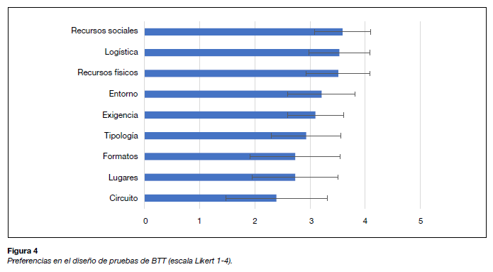 Referente a las preferencias en el diseño de pruebas de BTT (Figura 4), fueron nueve los atributos valorados por los practicantes sobre una escala de 4, con los recursos sociales (personal de apoyo, atención, etc.) como los atributos que obtuvieron mayor nivel de importancia, con un 3.59 (0.51), seguidos muy de cerca por la logística del evento (aparcamientos, transporte público, etc.), con 3.53 (0.55), y los recursos físicos de la organización (montaje de llegada, salida, avituallamientos, etc.), con 3.51 (0.58).