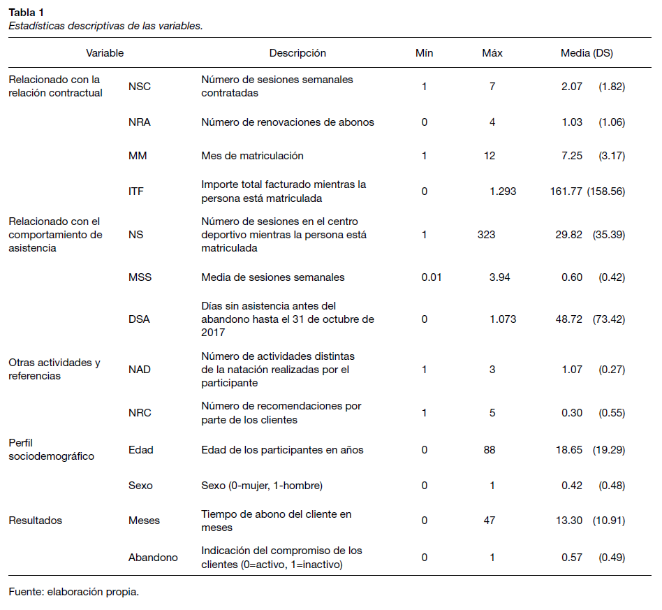 Tras un procedimiento selectivo, planteamos la hipótesis de que la retención (duración de la práctica) se ve influida por (i) el número de sesiones semanales a las que se abona el usuario, (ii) el número de renovaciones de la matrícula, (iii) el mes de la matrícula, (iv) el importe facturado, (v) el número de sesiones en el centro deportivo, (vi) el número de sesiones medias semanales, (vii) los días sin asistencia, (viii) el número de otras actividades, (ix) el número de recomendaciones por parte de los clientes y, por último, (x) la edad y (xi) el sexo.