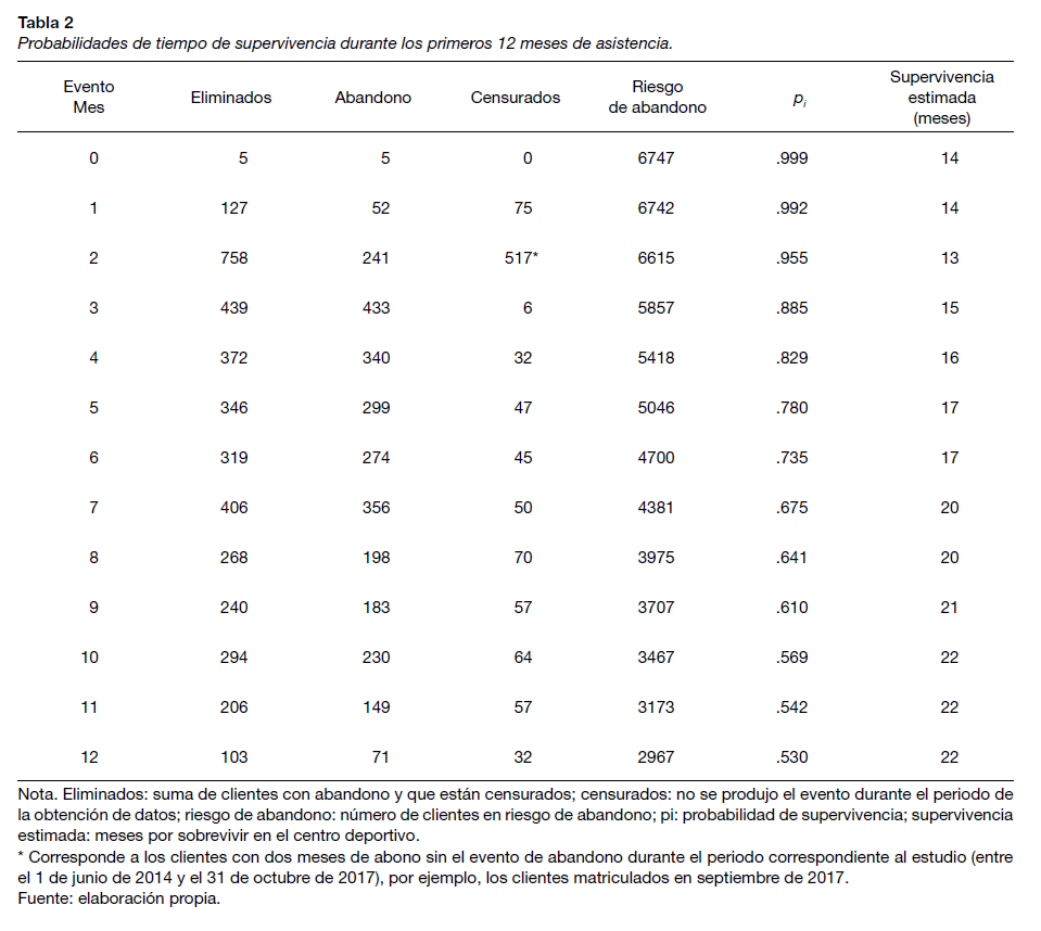 En la Tabla 2 se muestra la probabilidad del tiempo de supervivencia de la persona en los 12 primeros meses de práctica de la natación (columna pi –probabilidad) y la mediana del tiempo de supervivencia fue de 14 meses. La probabilidad de que las personas siguieran practicando natación más allá de los seis meses fue del 73.5%, lo que representa un riesgo de abandono del 26.5% y un tiempo de supervivencia estimado de 17 meses. La probabilidad de retención de los nadadores más allá de los 12 meses fue del 53.0%, lo que representa un mayor riesgo de abandono (el 47%) con una supervivencia estimada de 22 meses después de la matriculación.