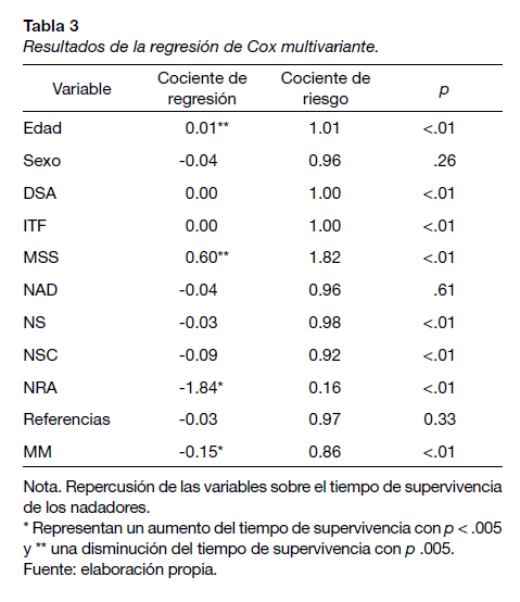 Se observó que el número de renovaciones de matrícula afecta a la tasa de supervivencia de los nadadores, de modo que por cada renovación se reduce el abandono en un 84% (véase la Tabla 3 – cociente de riesgo = 0.16, p < .01).