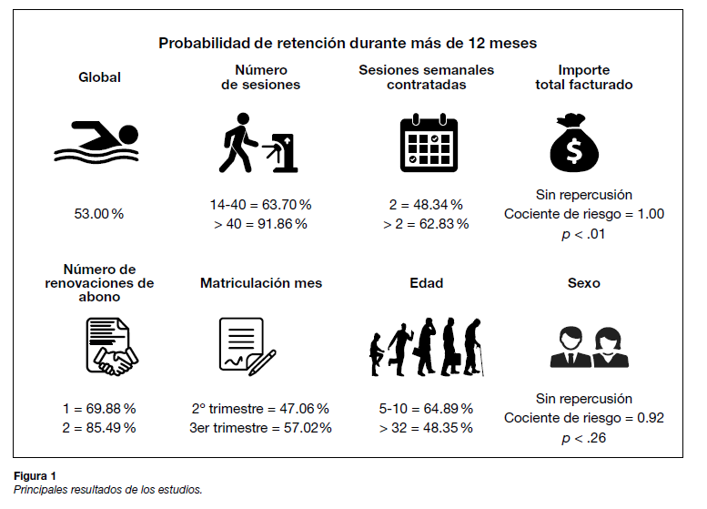 El número de sesiones a las que se abonan los usuarios resultó tener un efecto positivo sobre el tiempo de supervivencia, lo cual puede explicarse por dos aspectos: en primer lugar, la intención de la persona de hacer ejercicio con regularidad, relacionada con los efectos beneficiosos percibidos de la práctica regular de actividad física (en este caso, la práctica de la natación); en segundo lugar, el mayor nivel de satisfacción de las necesidades fundamentales genera un mayor deseo de continuar (Deci y Ryan, 2000), lo cual, a su vez, da lugar a un mayor nivel de retención.