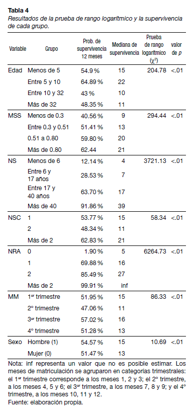 También hay diferencias significativas entre los grupos (χ2 = 86.33, p < .01) en cuanto al momento de la matriculación: el grupo de personas que se inscriben en el tercer trimestre tiene una probabilidad de supervivencia a los 12 meses del 57.02%, superior a la de las personas que se inscriben en otros trimestres (véase la Tabla 4).