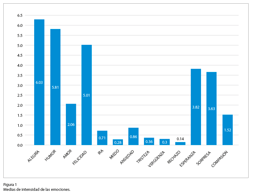 En relación con el comportamiento de cada una de las trece emociones por separado, observamos que la emoción que se dio con más intensidad fue la alegría, seguida del humor, la felicidad y el amor, que tiene unos valores relativamente bajos en comparación con las emociones del mismo grupo. En las negativas, la emoción que se dio con más intensidad fue la ansiedad y la que menos, el rechazo. En cuanto a las emociones ambiguas, las más sentidas fueron la esperanza, en segundo lugar, la sorpresa y finalmente la compasión, como podemos observar en la Figura 1.