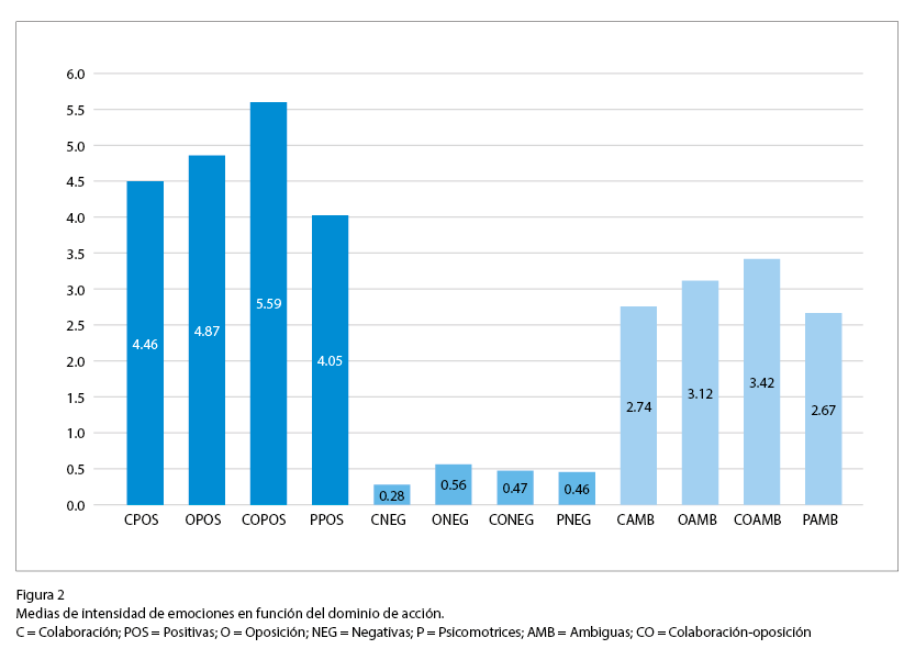 Si nos fijamos en las emociones negativas y coincidiendo con algunas de las investigaciones (Duran et al., 2014; Lavega et al., 2013a; Lavega et al., 2011), la actividad que genera con menor intensidad emociones negativas resulta ser la de colaboración. Nos parece importante prestar atención en este punto, pues el segundo dominio o el primero (Falcón et al., 2020) que provoca con menor intensidad emociones negativas es el psicomotor. Vemos cómo ambos dominios carecen de oposición; esto nos hace pensar que quizás el elemento oposición sea generador de emociones negativas.