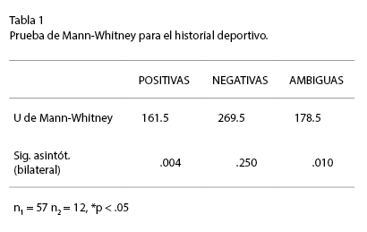 En relación con la variable historial deportivo y atendiendo a las hipótesis planteadas, observamos que, en general, sí hay diferencias a la hora de percibir la intensidad de las emociones entre los participantes que sí tenían experiencia deportiva y los que no, en las emociones positivas y las ambiguas (Tabla 1): los que sí tenían experiencia deportiva presentaron intensidades más altas que los que no la habían tenido.