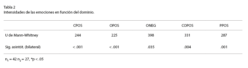 Se observó que, en algunas de las categorías y grupos de emociones, concretamente en las de colaboración positivas (CPOS), oposición positivas (OPOS), oposición negativas ONEG), colaboración-oposición positivas (COPOS) y las psicomotrices positivas (PPOS), existían diferencias significativas en cuanto a la intensidad de las emociones (Tabla 2). En todos los casos, fueron los varones quienes tuvieron los valores más altos.