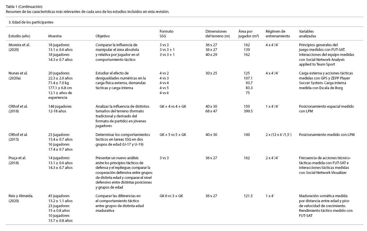Entre los hallazgos que se repitieron en estos ocho estudios, se puede destacar que, conforme aumenta la edad, la superficie del terreno de juego utilizada para atacar es mayor (Barnabé et al., 2016; Clemente et al., 2020a; Reis y Almeida, 2020), aumentando así la distancia entre los núcleos de los equipos (Clemente et al., 2020a; Olthof et al., 2015). Estos hallazgos se reflejan también en otros estudios, aunque se incluyan o modifiquen otras variables de las tareas SSG (Folgado, 2010; Olthof et al., 2018).