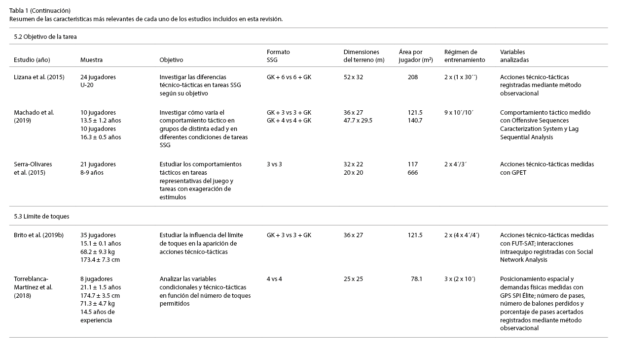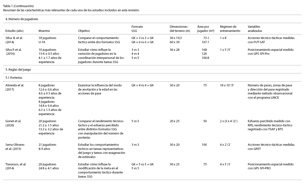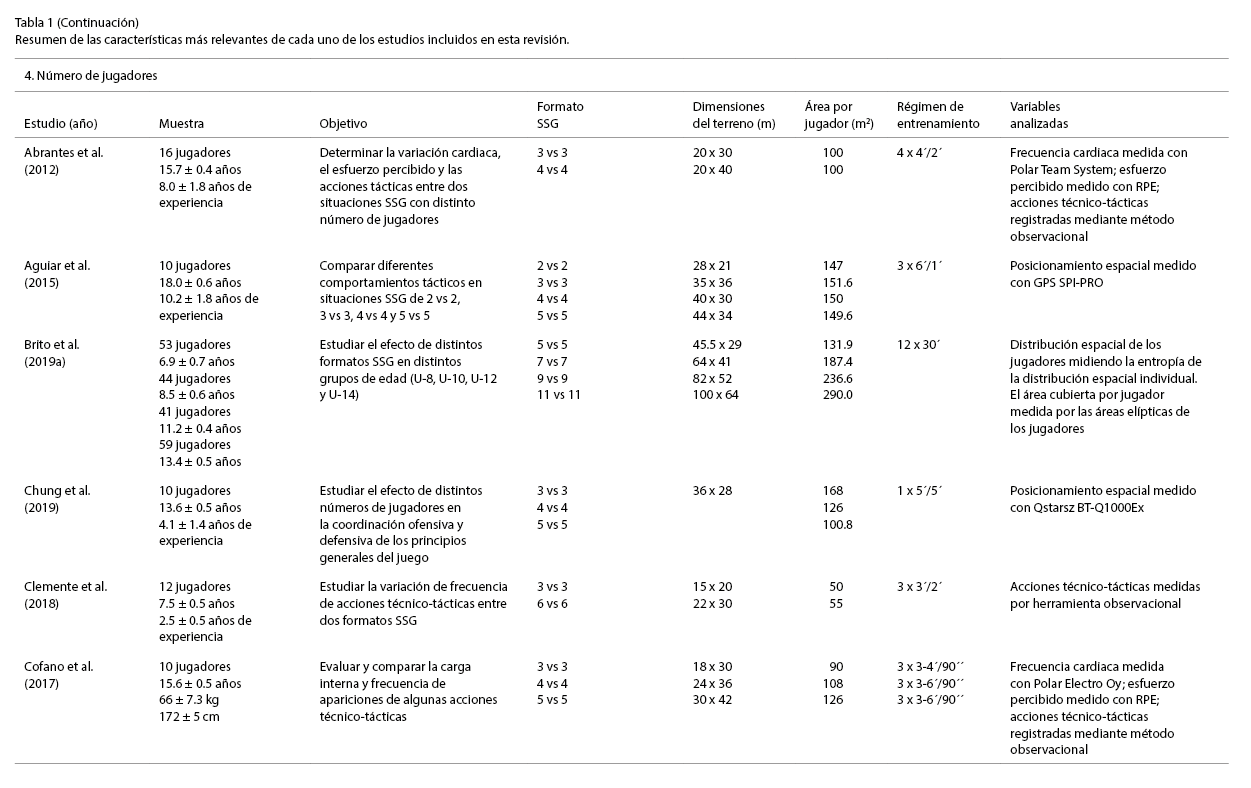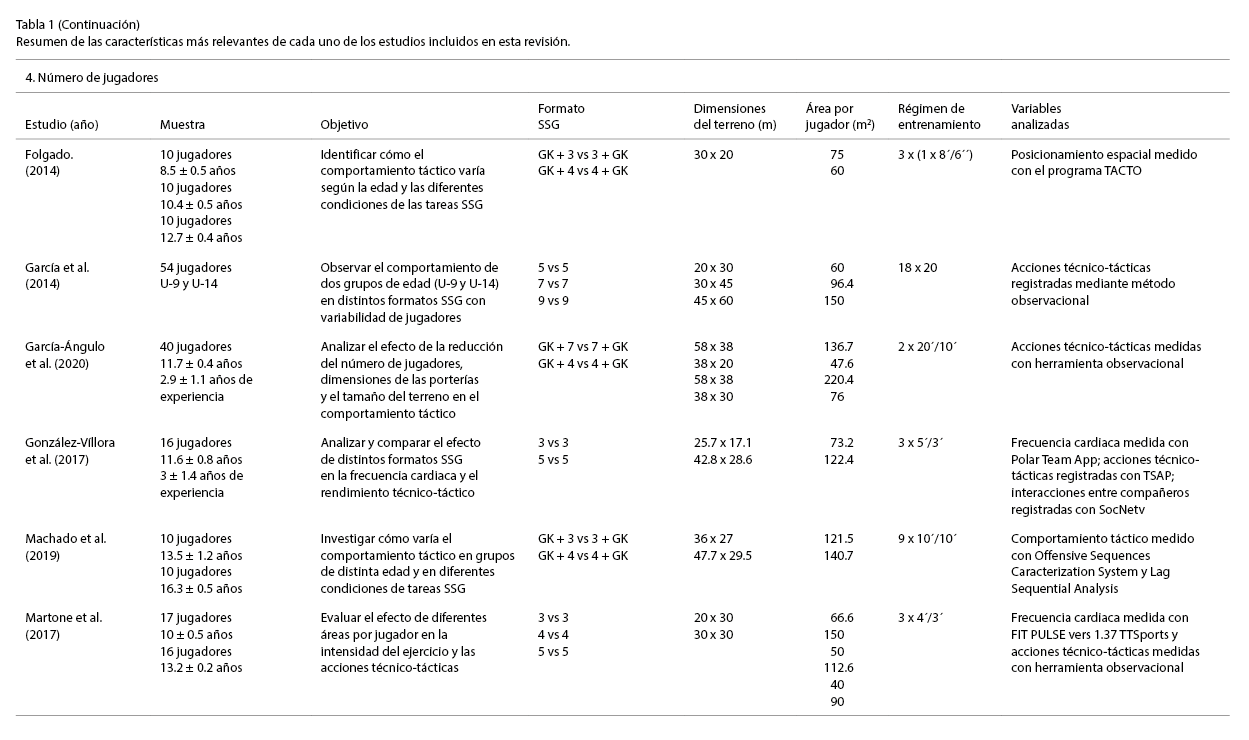 Del análisis de los hallazgos encontrados en estos tres trabajos, se destacó que en formatos SSG que involucran un menor número de jugadores, el número de acciones técnico-tácticas es mayor (Abrantes et al., 2012; Clemente et al., 2018). Esto coincide con lo observado en otros estudios aun modificando otras variables de las tareas SSG (García‐Ángulo et al., 2020). Sin embargo, hay que indicar que esto se refiere al número total de acciones ya que, según el tipo de acción, estas suelen aparecer con mayor o menor frecuencia en situaciones con un mayor y menor número de jugadores.