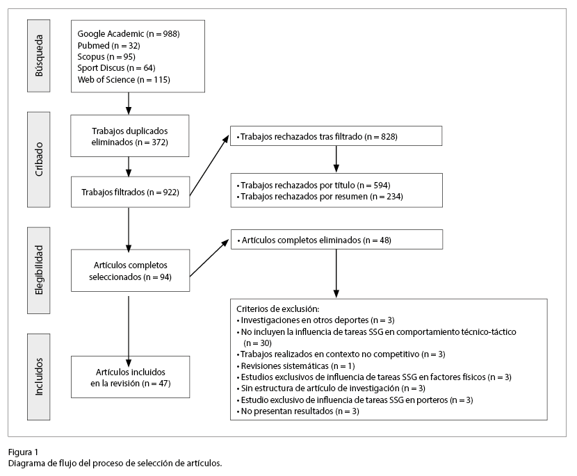 Los criterios de inclusión fueron los siguientes: a) escritos en inglés o español; b) exclusivamente realizados en el fútbol; c) completos y disponibles; d) contexto competitivo; y e) que incluyan el entrenamiento mediante tareas SSG. Los criterios de exclusión fueron: a) realizados por mujeres; b) ámbito educativo; c) no disponibles en inglés o español; d) que no aborden el comportamiento técnico-táctico en el fútbol; e) que solo evalúen la influencia de las tareas SSG en el rendimiento condicional; f) sin estructura de investigación científica; g) que traten de la influencia del entrenador en el comportamiento técnico-táctico; h) que evalúen los comportamientos de los porteros; i) revisiones sistemáticas o actas resumen de congresos y h) que no presenten resultados.