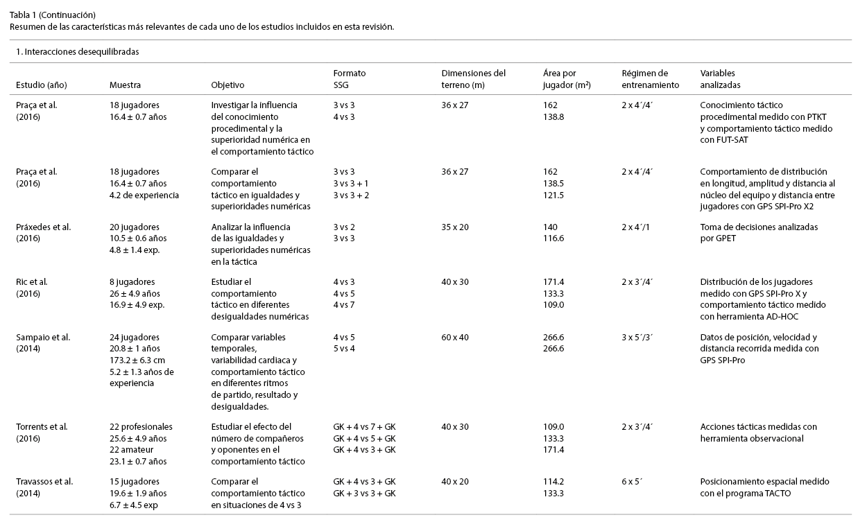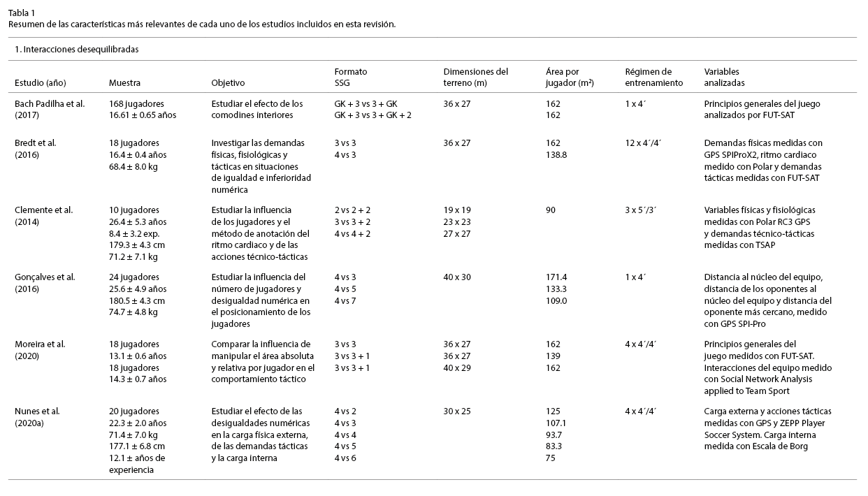 En cuanto a la influencia de las interacciones desequilibradas, cuatro de los trabajos revisados mantuvieron estable el área por jugador: Bach Padilha et al. (2017), Clemente et al. (2014), Moreira et al. (2020), y Sampaio et al., (2014). Esta podría ser una variable influyente que no se ha tenido siempre en cuenta. En el resto, los autores utilizaron dos formas para crear las situaciones de desigualdades numéricas: comodines interiores o exteriores ofensivos (Bach Padilha et al., 2017; Clemente et al., 2014; Moreira et al., 2020; Praça et al., 2016); la creación de situaciones permanentes de desigualdad (Gonçalves et al., 2016; Nunes, et al., 2020a).