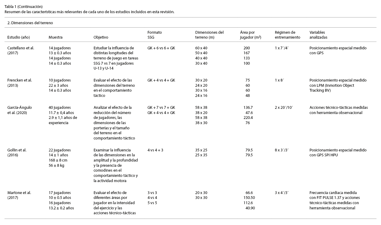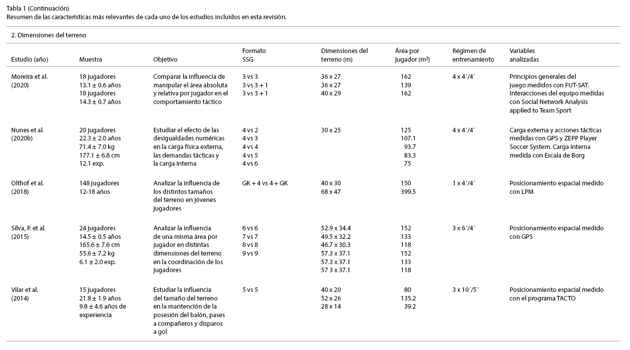 En cuanto a la influencia de las dimensiones del terreno de juego, de las diez investigaciones agrupadas bajo esta categoría, en seis de ellas se mantenía estable el número de jugadores participantes (Castellano et al., 2017; Frencken et al., 2013; Gollin et al., 2016; Nunes, et al., 2020b; Olthof et al., 2018; Vilar et al., 2014). En el resto de trabajos, cabe destacar que han modificado el número de participantes sin tener en cuenta que esta variación implicó una modificación del área por jugador, lo cual evidentemente influyó en la comparación de los resultados. Esta solo se mantuvo estable en la investigación de Silva et al., (2015).