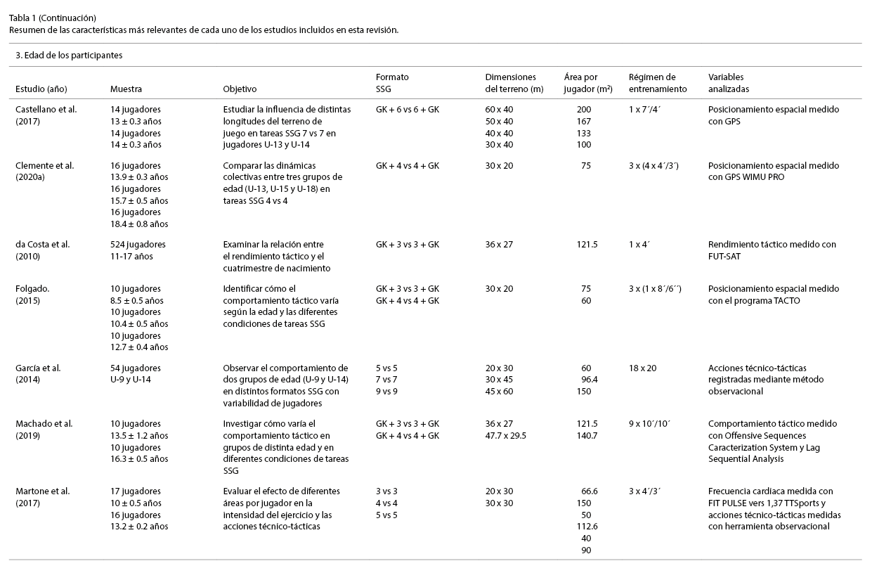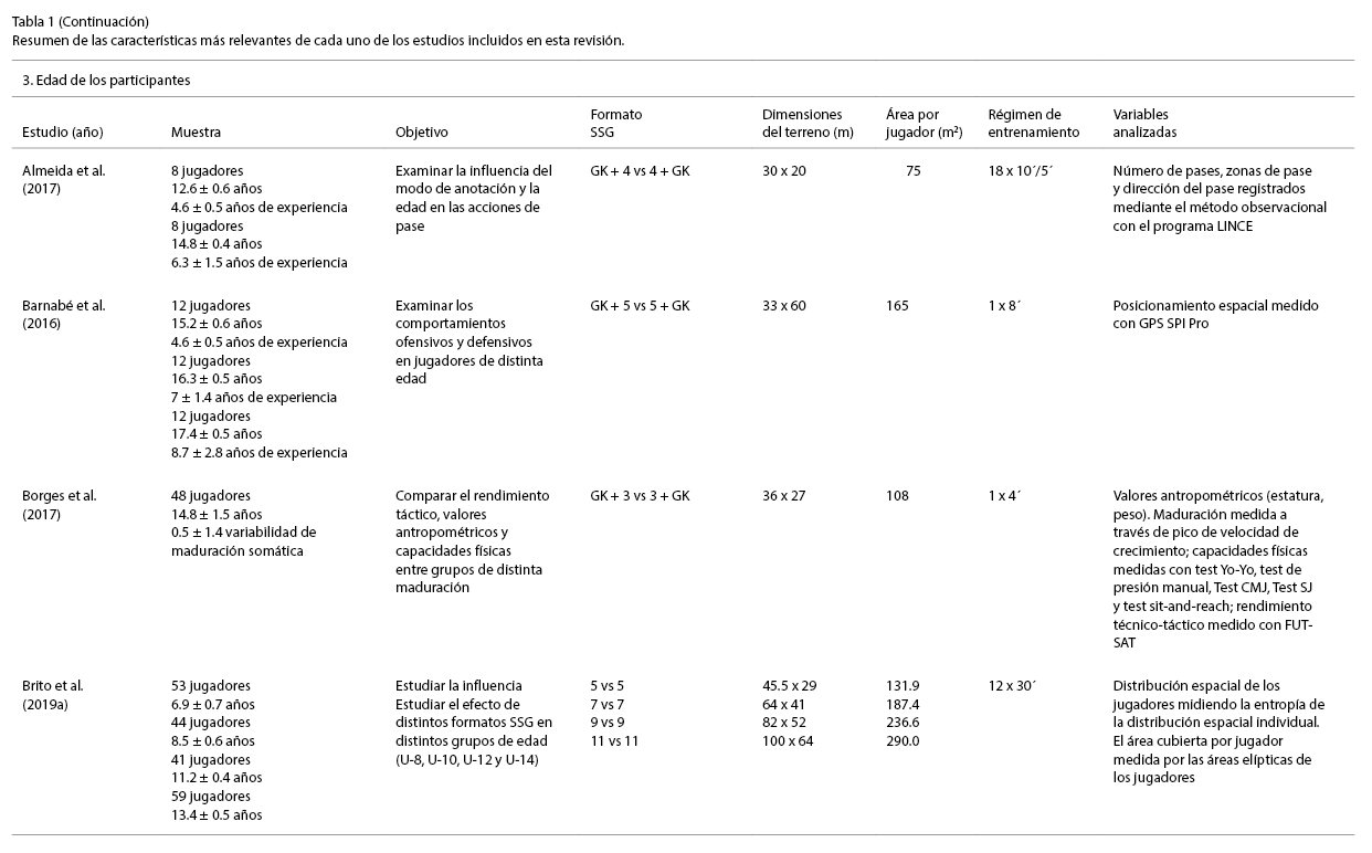 La mayoría de las investigaciones recogidas en este apartado según la influencia de la edad comparten otras variables (dimensiones del terreno de juego, número de participantes, método de anotación, etc.) que afectan al formato de las tareas SSG. Concretamente, en ocho investigaciones se estudió el efecto de la edad en el comportamiento técnico-táctico sin alterar otras variables (Almeida et al., 2017; Barnabé et al., 2016; Borges et al., 2017; Clemente et al., 2020a; da Costa et al., 2010; Olthof et al., 2015; Praça et al., 2018; Reis y Almeida, 2020) .