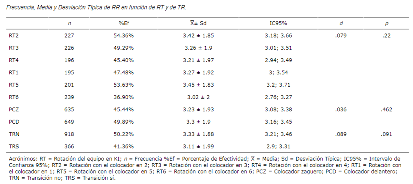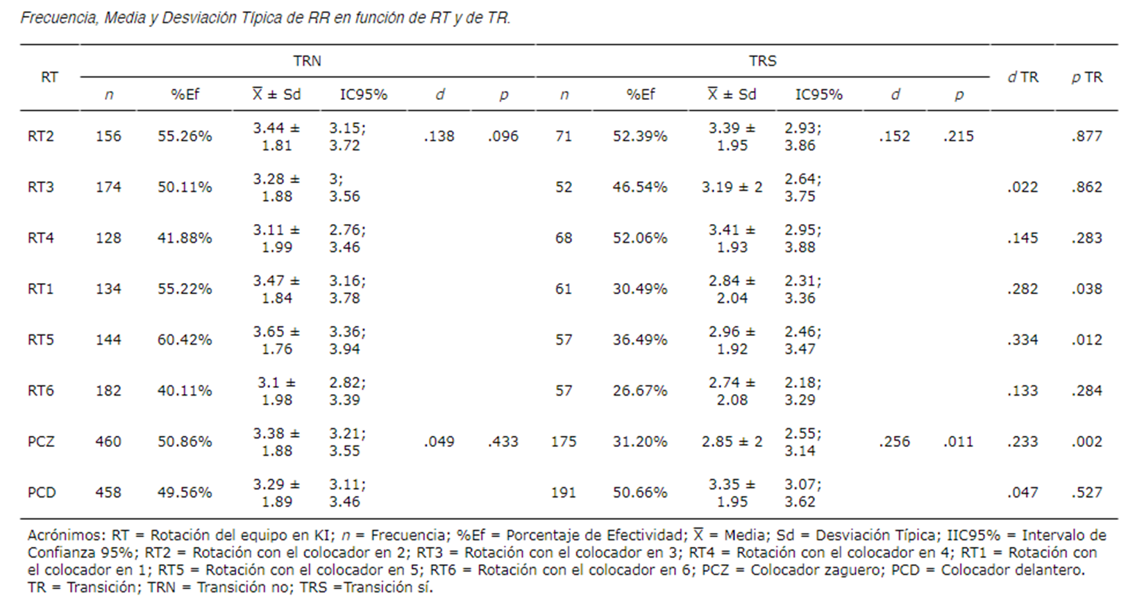 En la tabla 2 podemos observar la frecuencia y los valores de la media y desviación típica de la efectividad, así como el porcentaje de efectividad del receptor delantero con todos los datos agregados. No se obtuvieron diferencias significativas de RR en función de la RT, PC o la TR. Tabla 2Frecuencia, Media y Desviación Típica de RR en función de RT y de TR.