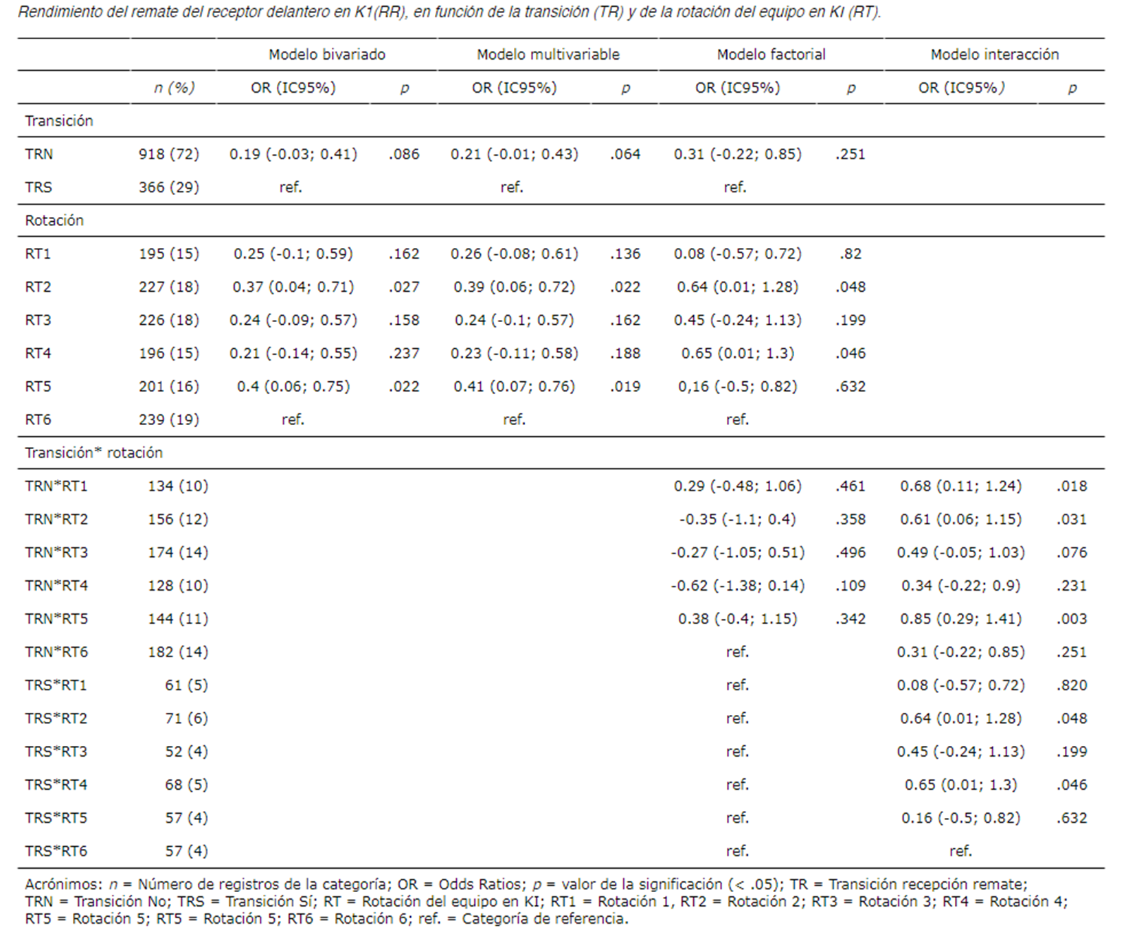 En la tabla 4 se muestran los resultados de las regresiones ordinales que evalúan la relación entre el RR y RT y la TR. En los modelos bivariados, no se observaron relaciones significativas entre RR y la RT (X²5=6.99; . =.222; .2=.006); ni tampoco entre RR y TR (X²1=2.89; . =.089; .2=.002). Sin embargo, se observaron pequeños incrementos de rendimiento de ataque en la RT2 (OR=0.37; IC95%=0.04; 0.71) y la RT5 (OR =0.4; IC95%=0.06; 0.75) en comparación con RT6. El modelo multivariable mejoró ligeramente las estimaciones, pero tampoco resultó significativo (X²6=10.34; . =.111; .2=.008). El modelo factorial mejoró las estimaciones, y resultó un modelo significativo (X²11=19,89; . =.047; .2=.016), por lo que decidió estudiarse la interacción entre la RT y la TR para facilitar la interpretación de los resultados. Esta interacción sugiere la importancia que tiene la TR en la efectividad del remate en algunas rotaciones. En particular, se consiguió mejor RR en la TRN*RT1 (OR=0.68; IC95%=0.11; 1.24), en la TRN*RT2 (OR=0.61; IC95%=0.06; 1.15), en la TRN*RT5 (OR=0.85; IC95%=0.29; 1.41), en la TRS*RT2 (OR=0.64; IC95%=0.01; 1.28) y en la TRS*RT4 (OR=0.65; IC95%=0.01; 1.3), siempre comparándolas con la TRS*RT6.