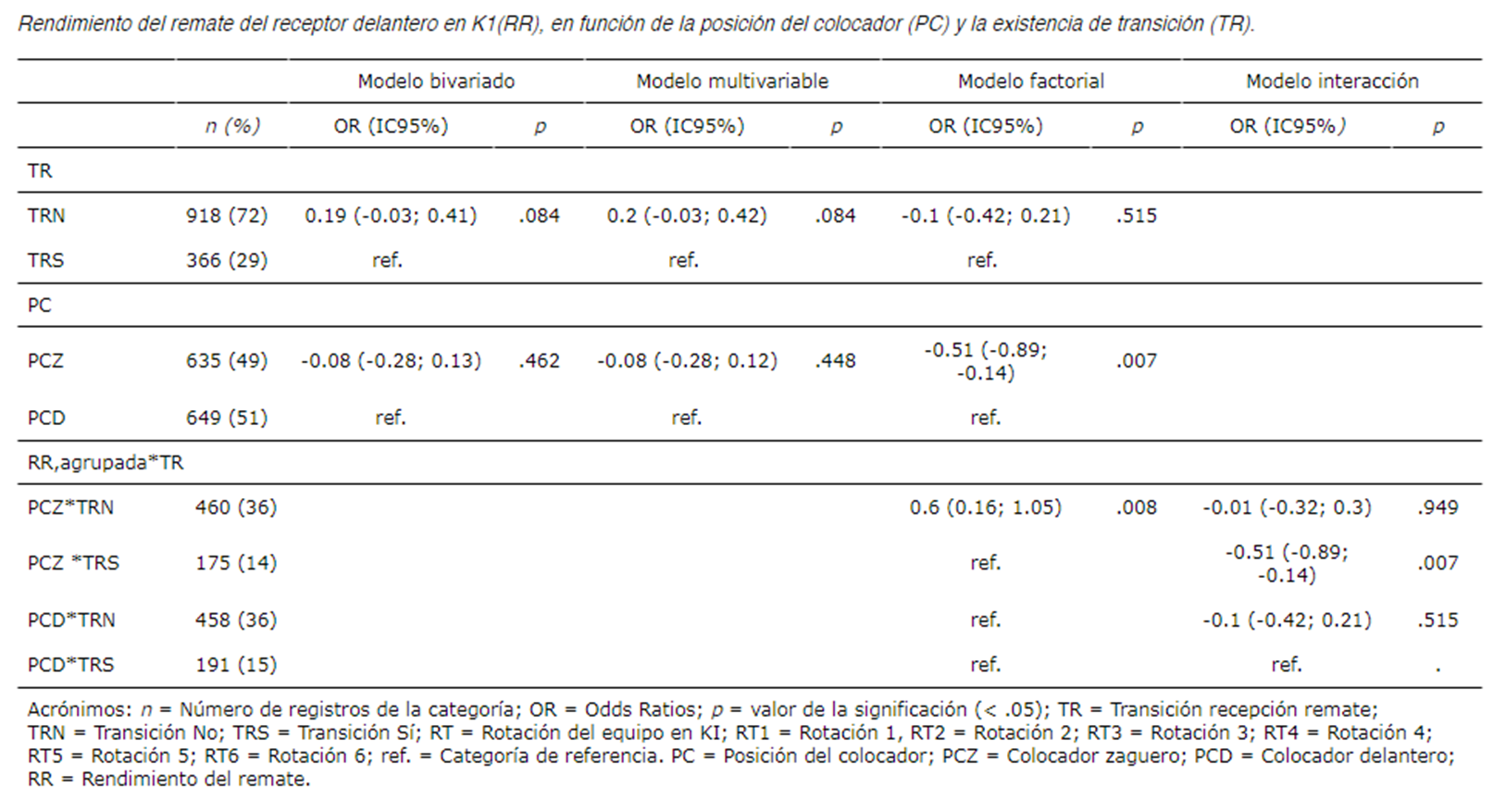 Por último, en la tabla 5 se presentan los resultados de las regresiones ordinales que evalúan la relación entre RR y la PC y la TR. En los modelos bivariados, no se observaron relaciones significativas entre el RR y la PC (X²1= 0.54; . =.462; .2<.001); ni tampoco entre el RR y la TR (X²1=2.89; . =.089; .2=.002). Tampoco se encontró un modelo multivariable significativo (X²2=3.47; . =.176; .2=.003). Pero, de nuevo, al evaluar el modelo factorial se observó una relación significativa entre RR y la interacción posición del colocador x transición (X²3=10.53; . =.015; .2=.009), lo que indica nuevamente la importancia que tiene la TR en el RR en algunas rotaciones concretas del juego. El estudio en profundidad de las interacciones demostró peor RR en las situaciones PCZ*TRS (OR=-0.51; IC95%=-0.89; -0.14) en comparación con las situaciones PCD*TRS.