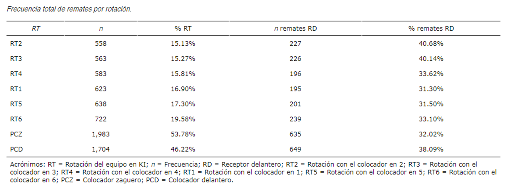 En la tabla 1 podemos observar la frecuencia y el porcentaje de remates del equipo en cada rotación y en función de la posición del colocador (53.78% PCZ; 46.22% PCD), así como la frecuencia y el porcentaje de remates del receptor delantero en cada rotación y de nuevo en función de la posición del colocador (32.02% PCZ; 38.09% PCD).