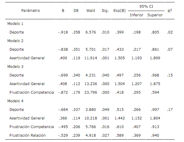En la tabla 3 se presentan los resultados de los MLG tomando como variable respuesta la asertividad en el deporte. La prueba ómnibus resultó significativa (x2 = 50.146 (4), p < .001). En su conjunto el modelo explica un 17% de la varianza. En el modelo 2 se observa que, en presencia de la asertividad en el deporte, el tipo de deporte continúa siendo una variable significativa, aunque explica un porcentaje muy bajo de la varianza. En el modelo 3 se incluye la variable frustración de competencia, que incrementa en un 8% la varianza explicada. Por último, en el modelo 4 se incorpora la frustración de relación, que explica un 2% más de la varianza. En consecuencia, el razonamiento moral sobre la asertividad en el deporte es explicado por la asertividad en general, el tipo de deporte que se practica (menos asertividad en los deportes de contacto), y la frustración de las necesidades psicológicas básicas de competencia y de relación por parte del entrenador.