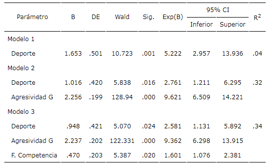 Los resultados de los MLG tomando como variable respuesta la agresividad en el deporte se recogen en la Tabla 4. La prueba ómnibus resultó significativa (x2 = 111.45 (3), p < .001). En su conjunto el modelo explica un 34% de la varianza. En el modelo 2 se observa que, en presencia de la agresividad general, el tipo de deporte continúa siendo una variable significativa, aunque explica un porcentaje bajo de la varianza. En el modelo 3 se incorpora la variable frustración de competencia. En definitiva, el razonamiento moral sobre la agresividad en el deporte viene determinado por la agresividad en general, el tipo de deporte que se practica (mayor agresividad en los deportes de contacto), y la frustración de la necesidad psicológica básica de competencia por parte del entrenador.