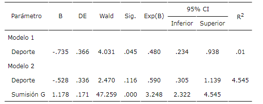 En la prueba ómnibus, los resultados del MLG tomando como variable respuesta la sumisión en el deporte resultó significativa (x2 = 48.390 (2), p < .001). El modelo 2 explica un 16% de la varianza. En este modelo se observa que, en presencia de la sumisión general, el tipo de deporte deja de ser una variable significativa.