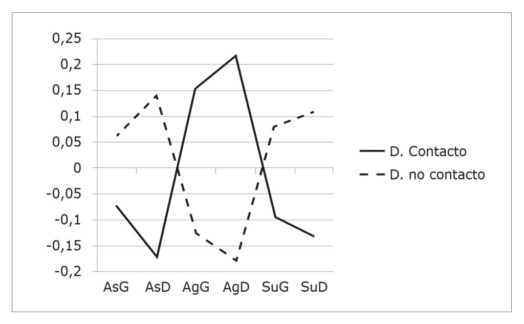 Las participantes mostraron diferencias estadísticamente significativas entre sí en seis variables en función del tipo de deporte practicado. Las practicantes de deportes de contacto puntuaron más alto en las tendencias de acción agresiva en el deporte y en otros contextos, y más bajo en las tendencias de acción asertiva y de sumisión en el deporte que las deportistas que practicaban deportes en los que no hay contacto físico con las adversarias (Tabla 1). Como el razonamiento sobre tendencias de acción se cuantificó con base en preguntas dicotómicas, se pudo concluir que el grupo de deportistas que practicaban deportes de contacto presentaba niveles más bajos de razonamiento moral que las deportistas que practicaban deportes en los que no hay contacto físico entre los participantes. También se observó que las practicantes de deportes en los que no hay contacto físico percibían un mayor grado de apoyo de las necesidades psicológicas básicas de competencia y de relación por parte de su entrenador. En las Figuras 1 y 2 se observa una clara tendencia más adaptativa en el grupo de deportistas que no practican deportes de contacto, tanto en razonamiento moral como en apoyo/frustración de las necesidades psicológicas básicas por parte del entrenador, salvo en frustración de autonomía.