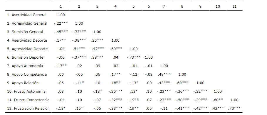Tanto en el contexto deportivo como en la vida en general las correlaciones más altas entre las tres variables que miden las tendencias de acción se dieron entre sumisión y agresividad. Las tres tendencias de acción en la vida cotidiana correlacionaron positivamente con la variable correspondiente en el deporte, aunque la agresividad fue la que mostró una correlación más elevada. En el deporte, estas mismas dimensiones mostraron un mayor grado de correlación con las variables que miden el apoyo/frustración de las necesidades psicológicas básicas por parte del entrenador, salvo la variable sumisión, que no mostró ninguna relación en el contexto deportivo. También se observó una mayor correlación en el contexto deportivo de la asertividad y la agresividad (en negativo y en positivo, respectivamente) con las variables que miden la frustración de las necesidades psicológicas básicas.