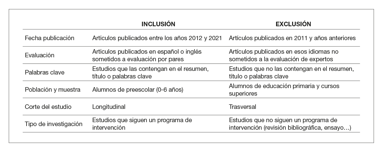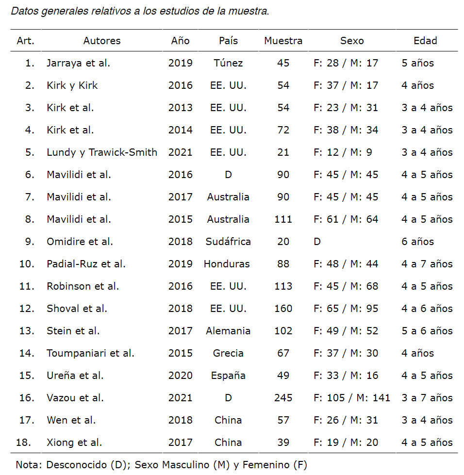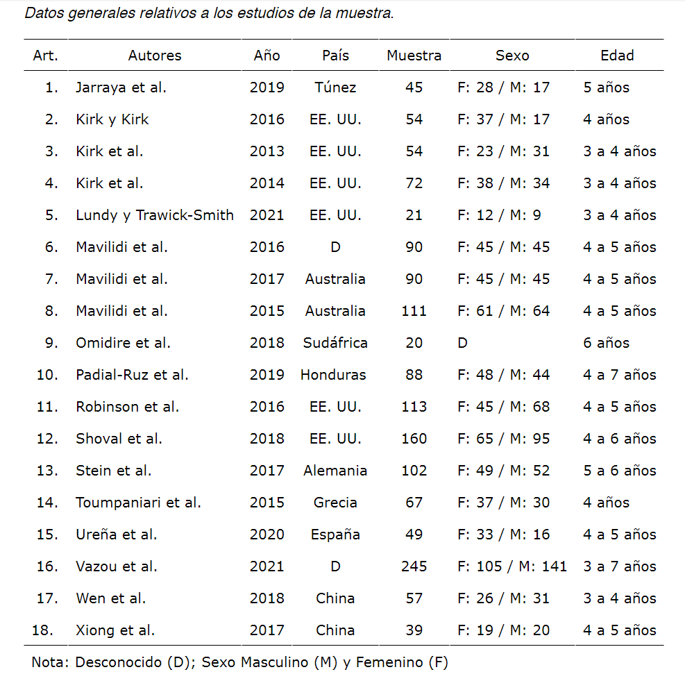 Se encontraron n = 3 estudios (16.7 % de la muestra total) que relacionan la AF con la alfabetización en la etapa de preescolar. Todos utilizaron el mismo diseño de investigación, como se recoge en la tabla 2, con un mayor tiempo de intervención (8 meses) en el estudio de Kirk y Kirk (2016).