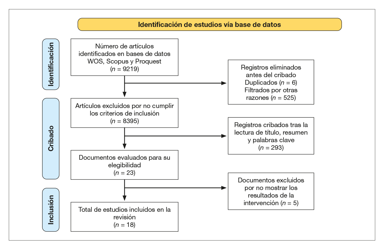 Para aplicar los criterios de inclusión y exclusión, se realizó una primera lectura del resumen y título. Posteriormente, se efectuó una lectura profundizada del texto completo. A continuación, se realizó una tercera y última criba en la que, a partir del resumen, se seleccionaron únicamente aquellos estudios en los que se habían realizado programas de intervención en preescolar, acotando la muestra a 293 artículos. Tras las consideraciones de inclusión y exclusión, en la siguiente figura se muestra el proceso, fijando una muestra válida para este estudio de un total de 18 artículos científicos para la síntesis cualitativa.