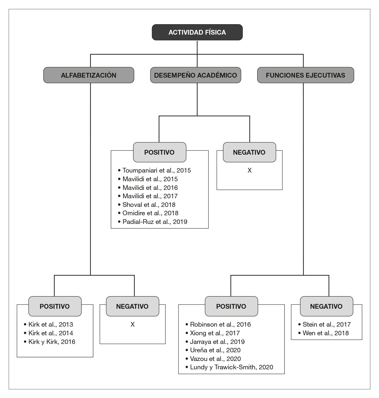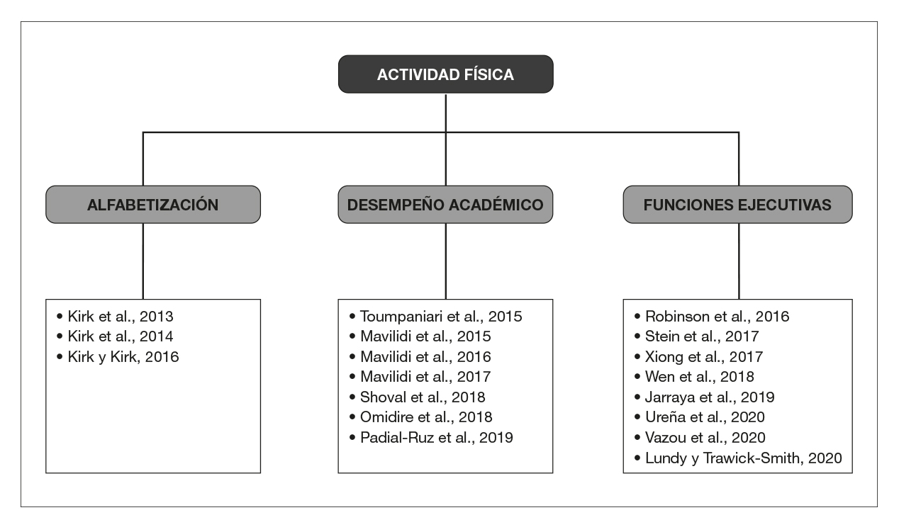 Para la síntesis de los resultados, se realizó un agrupamiento de los diferentes artículos, distinguiendo entre los estudios en los que se relaciona directamente la AF con la alfabetización, integración de la AF en los contenidos curriculares y el rendimiento académico, y los que relacionan la AF con otros factores determinantes para el rendimiento como son las funciones ejecutivas (figura 3).
