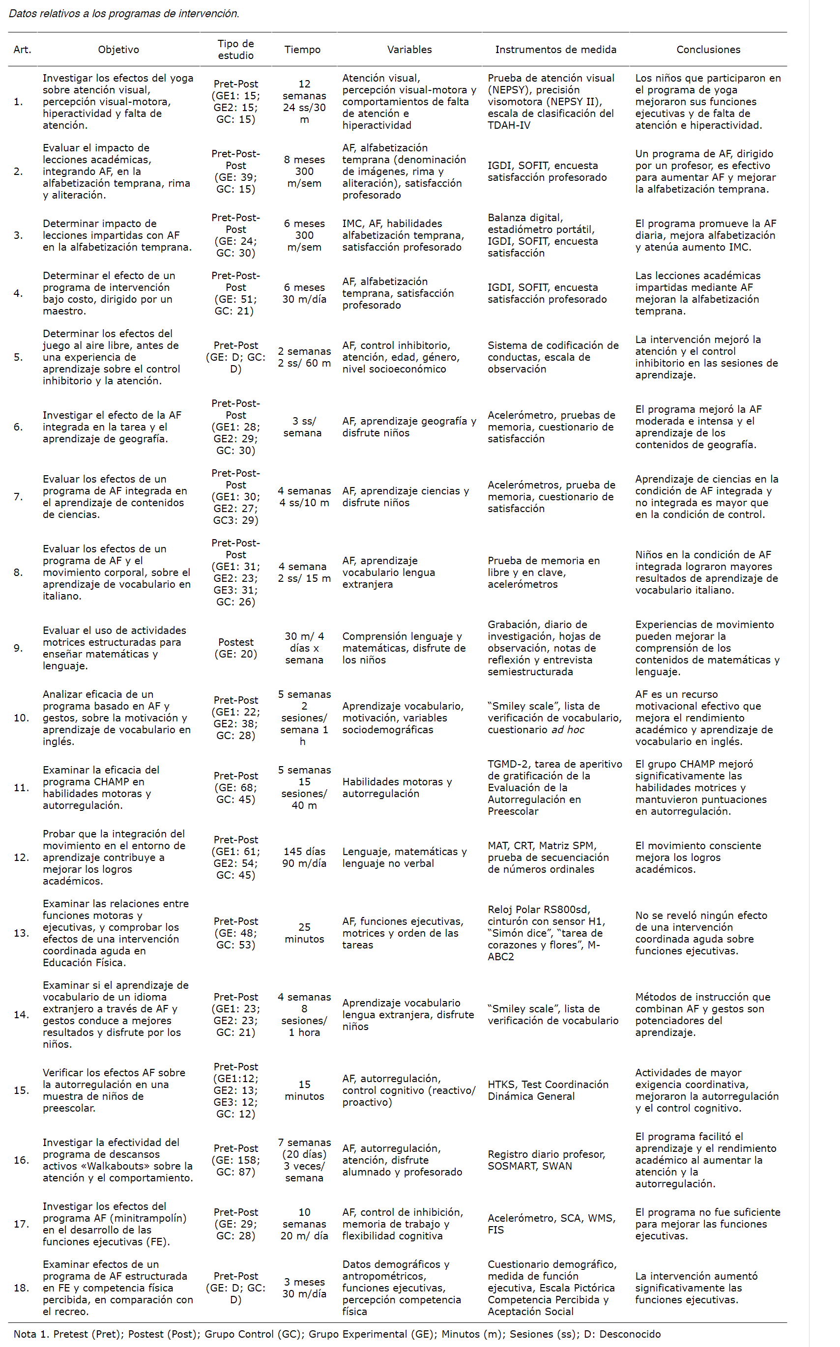 Al igual que revisiones realizadas con anterioridad en la etapa de primaria (Chacón-Cuberos et al., 2020), la mayoría de estudios analizados en esta revisión demuestran cómo la práctica de AF permite una mejora del rendimiento académico y el desarrollo de las funciones ejecutivas; y aunque no se puedan sacar conclusiones sobre el tipo de AF, intensidad y duración de las mismas a través de los artículos incluidos en esta revisión, algunas de las características de la AF (tabla 3) que pueden producir efectos positivos sobre estos parámetros en la etapa de preescolar son: